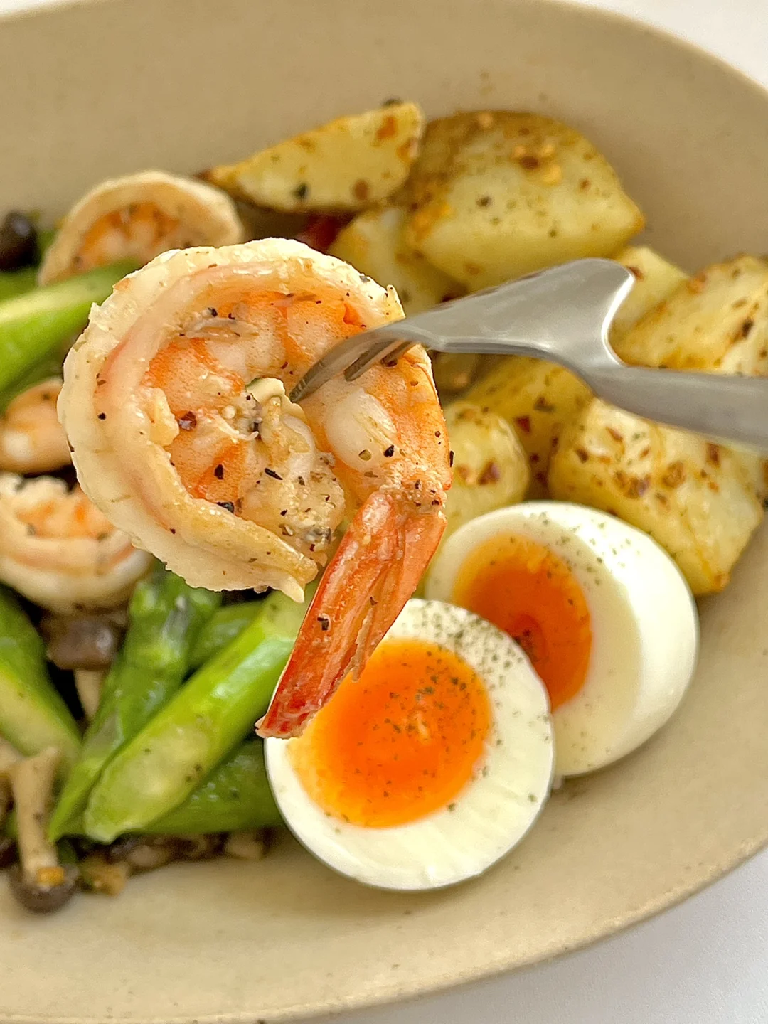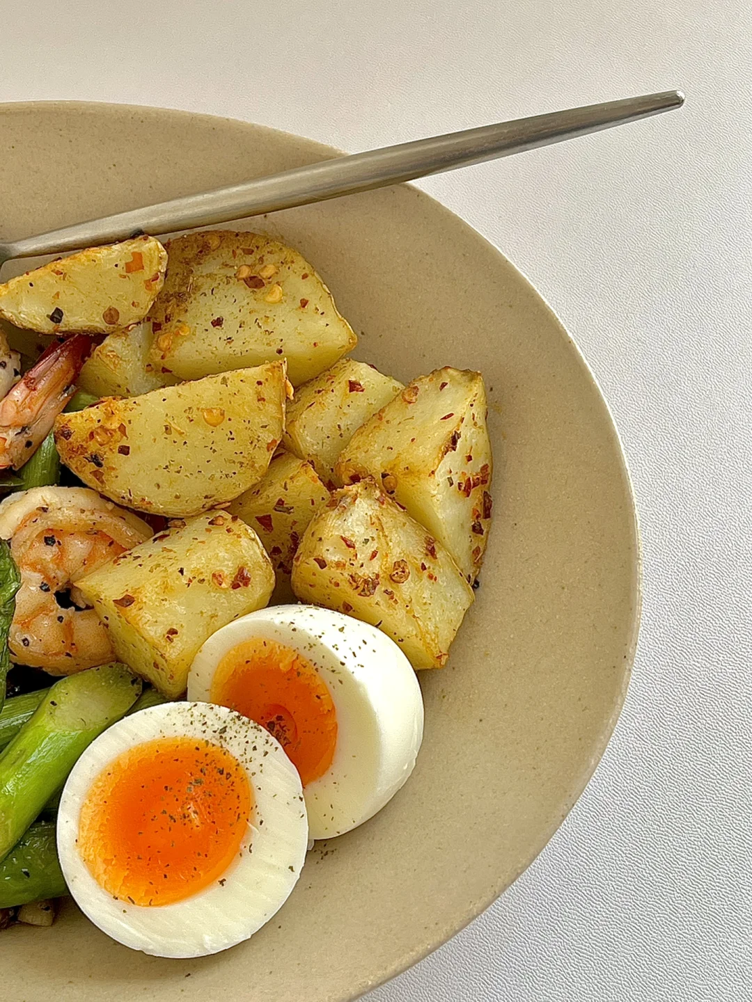 ☀️工作日早餐|虾仁芦笋鸡蛋烤薯角温沙拉🥗