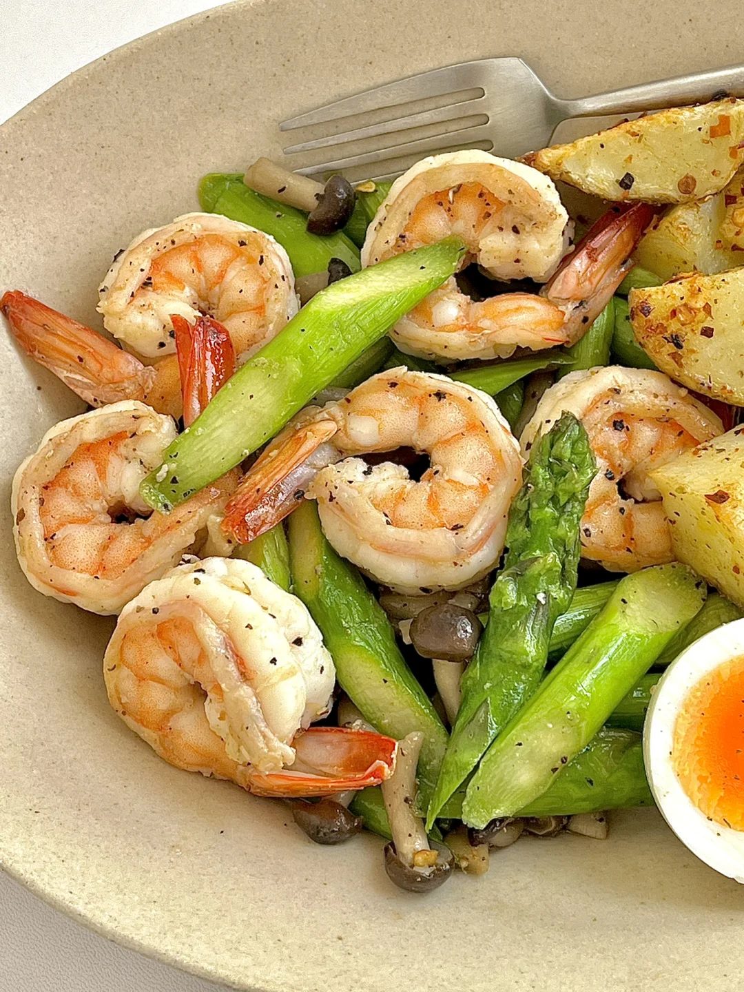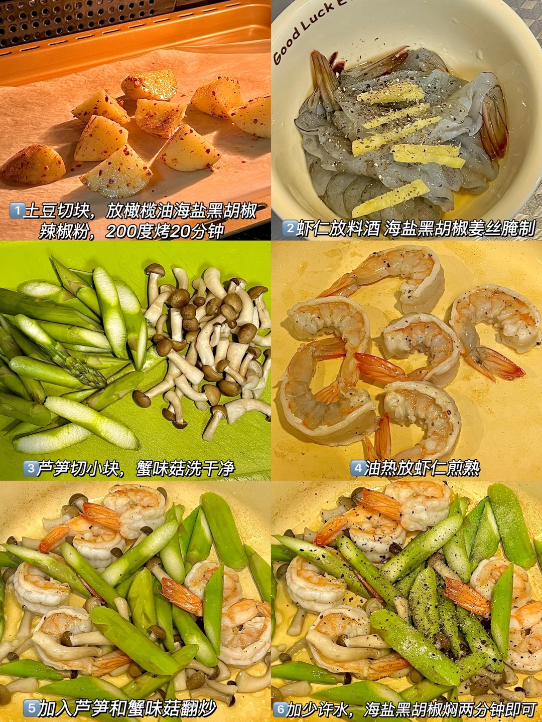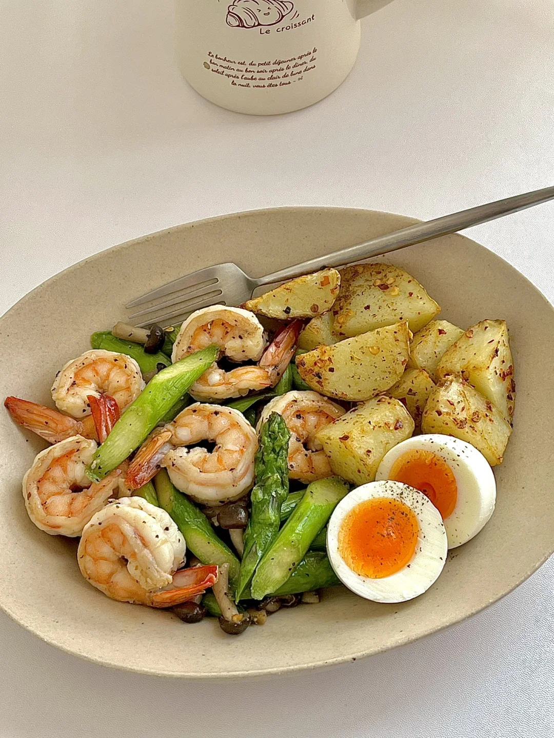 热气腾腾的三餐 今日份早餐分享: 虾仁芦笋鸡蛋烤薯角温沙拉 一杯美式☕️ . 1️⃣一个土豆切块,放橄榄油,海盐黑胡椒,辣椒粉搅拌均匀。烤箱200度烤20分钟。 2️⃣虾仁放海盐黑胡椒,料酒,姜丝腌制一会儿。 3️⃣芦笋切小块,蟹味菇洗干净。 4️⃣油热放入虾仁煎至两面熟,放入芦笋和蟹味菇翻炒。因为油少,少放一点水,海盐黑胡椒焖两分钟。 . 先吃蛋白质,再吃蔬菜,最后吃碳水。 到了最后薯角剩了好几块实在吃不下了,真的好饱腹,今天的虾仁太大了,哈哈 . 祝大家新周快乐呀!