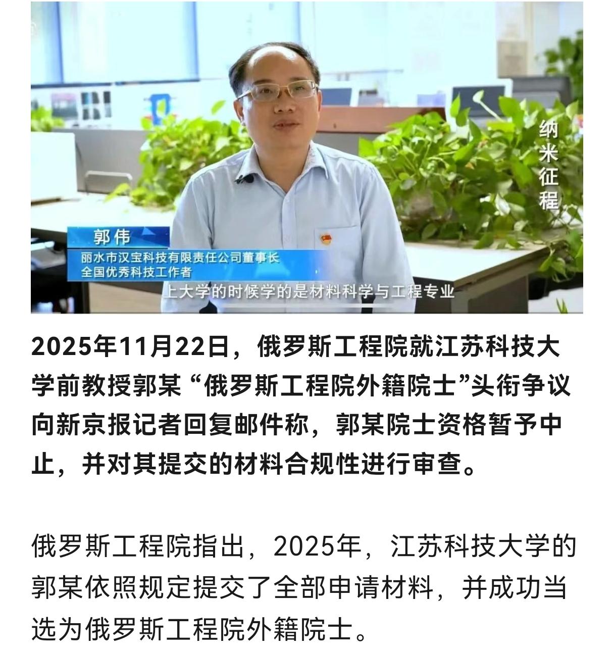丢人丢到国外去了!江苏科技大学前教授郭某这事儿闹大了。 2025年郭某当选俄罗斯工程院外籍院士,可近期他被指学术履历造假。11月18日,江苏科技大学调查认定他有严重学术不端行为,解除聘用协议还报了警。 11月22日,俄罗斯工程院回应,对郭某提交材料合规性审查,期间其院士资格暂中止,信息也从官网移除,结果会及时公布。郭某曾是学校首席科学家,发过180余篇SCI论文。这不仅让学校蒙羞,还把丑事闹到国外,学术圈的诚信真得好好抓一抓了。 江苏科大郭伟 外国野鸡院士 外籍院士