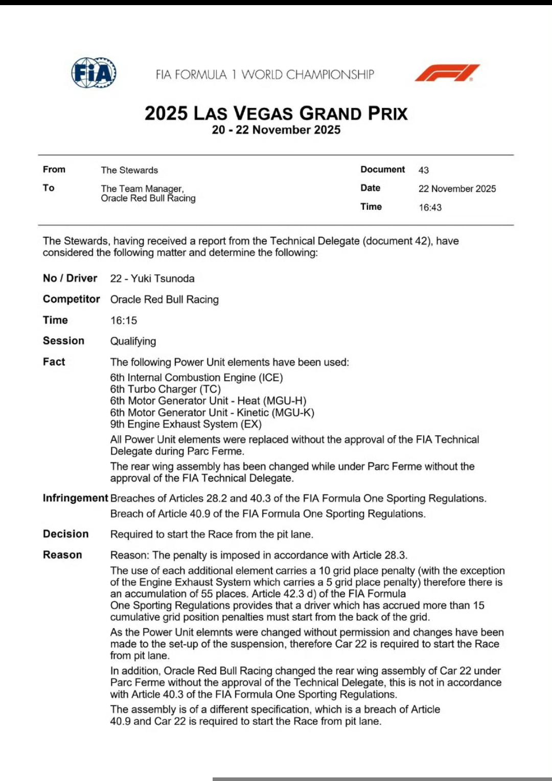 在F1拉斯维加斯大奖赛正赛前,红牛车队为角田裕毅更换第六套PU部件,且打破车检区规则,日本车手将从维修区起步。