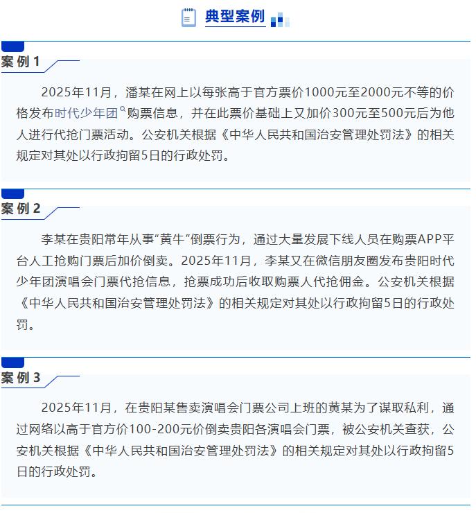 2025年11月以来,贵阳市公安局加大整治“黄牛”倒票违法犯罪力度,查处了一批违法倒卖演出门票案件,行政拘留了一批违法人员。
