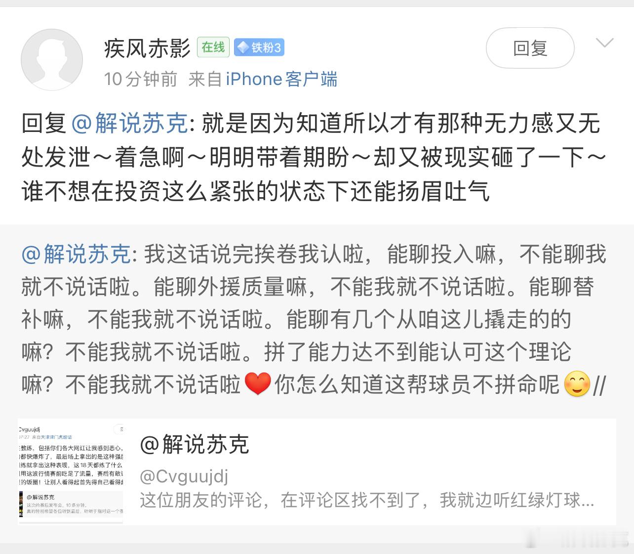 单独回您一条,我相信有些朋友能理解我的表达哈。好多球迷去提脚,结果输了,不老爽的,小发泄一下就来。有一些纯纯黑子,就求求你们走开我这场球真的是一点感觉没有,我自己其实有点庆幸,窃喜。因为把投入什么的巴拉巴拉的不聊了先。这一个赛季下来,让人骂还是小事。那些让人算计的压力,还好挺过来了。我只能说这么一句,就这么点水平,这么点人,关系也不硬。但是最硬的那个,最后自己都病那儿了,硬是撑到了最后。他不仅要遭受外面人的糟改诋毁,各级leader的压力,还要接受天津部分球迷在那“人情世故”。我特同意有些朋友说的,我们都豁出去给你提脚,你没赢球,我同意,真同意。但我更同意,天津足球已经有这么多人愿意来给你提脚了,这已经赢了那段时间没崩,挺过来了,不容易哈。于根伟、津门虎、天津媒体,尤其好多好多的天津球迷,还有疾风赤影😀,挺过来啦,不容易哈