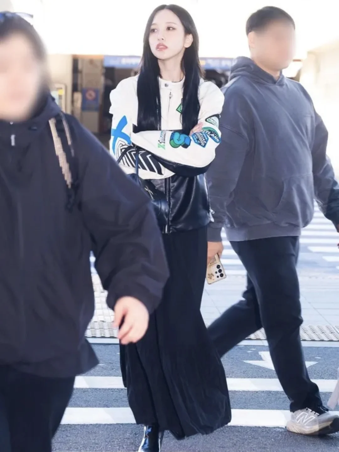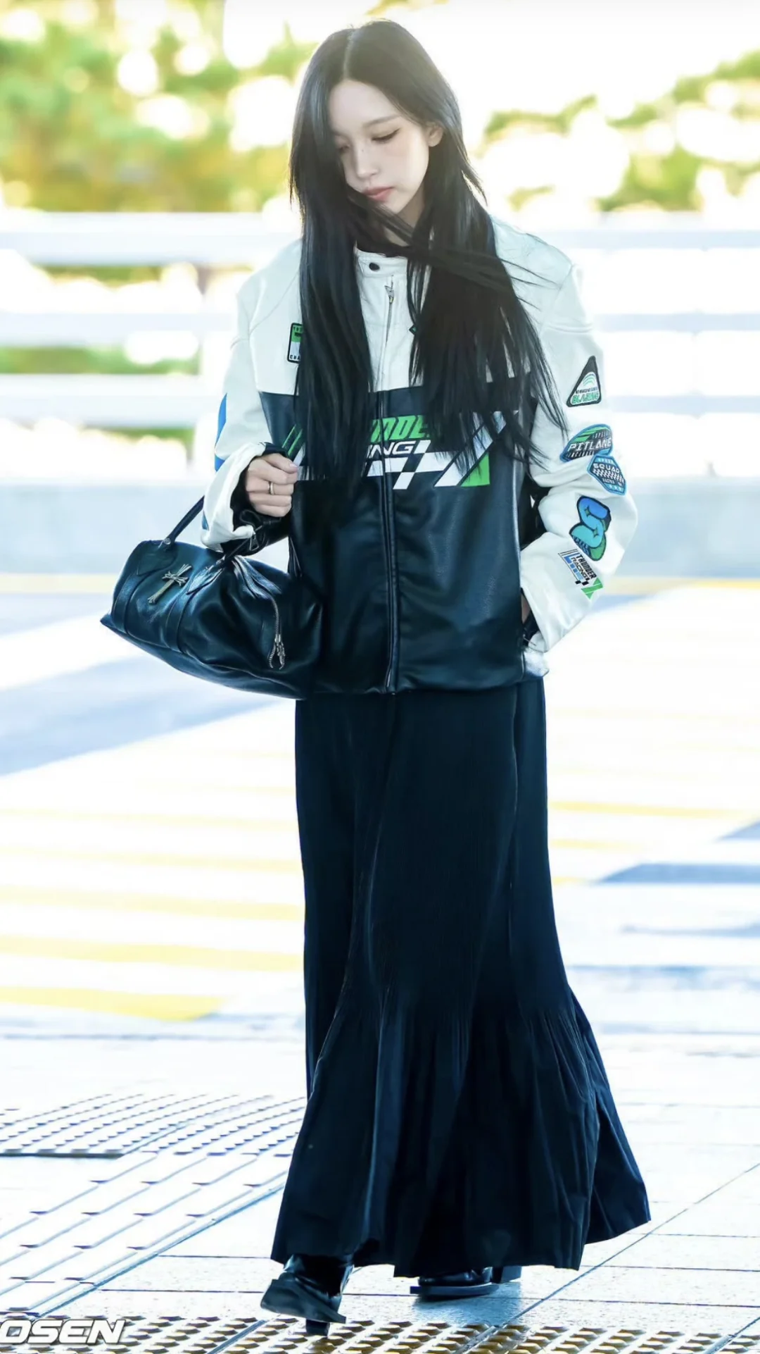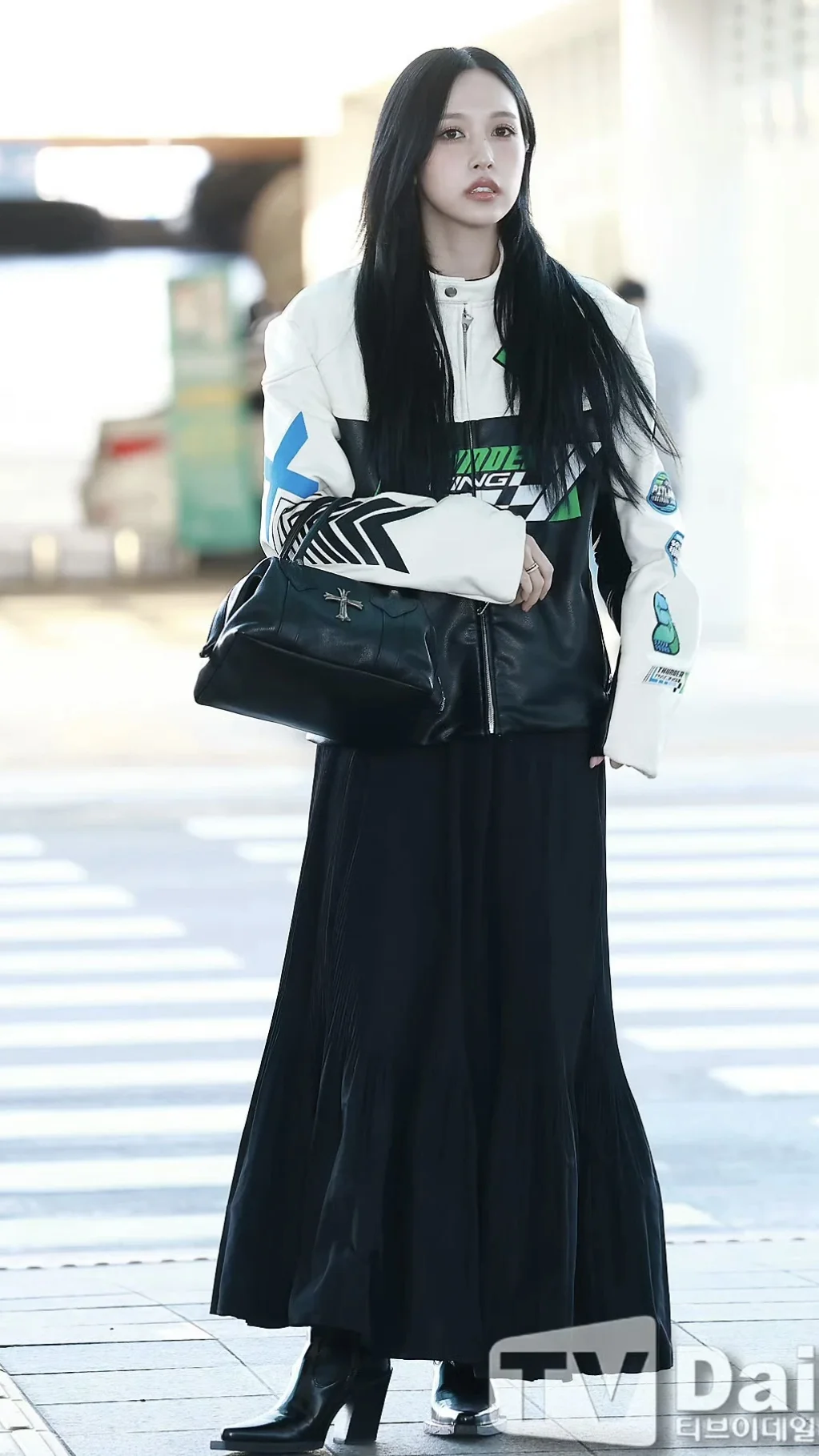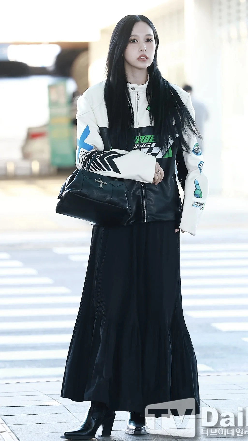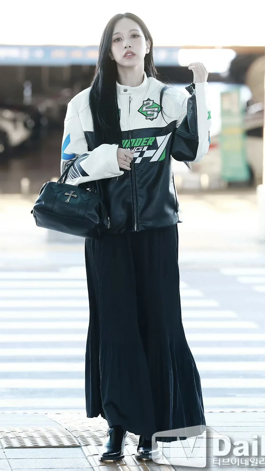 Mina名井南的机场时尚教科书!机车夹克+长裙