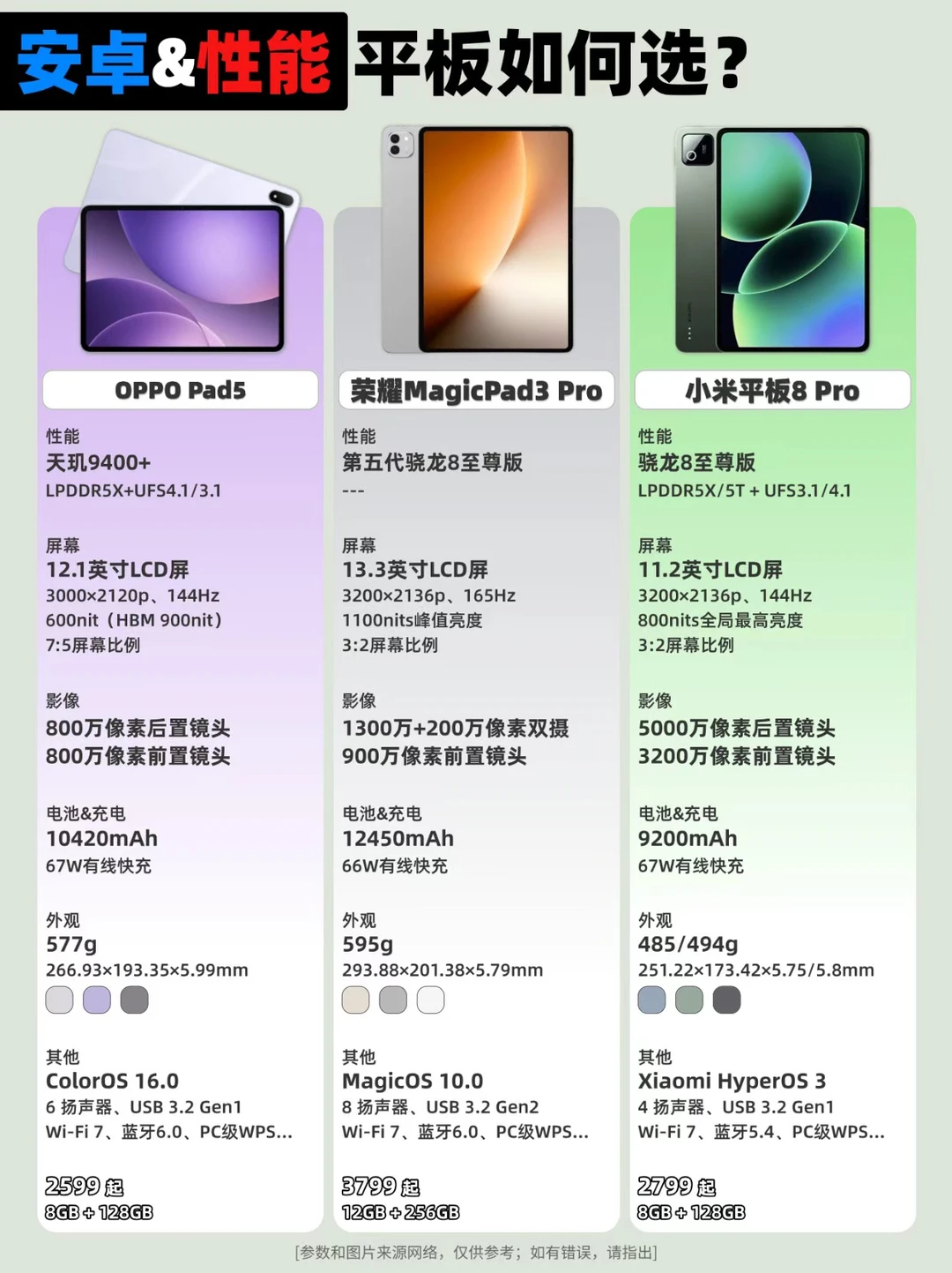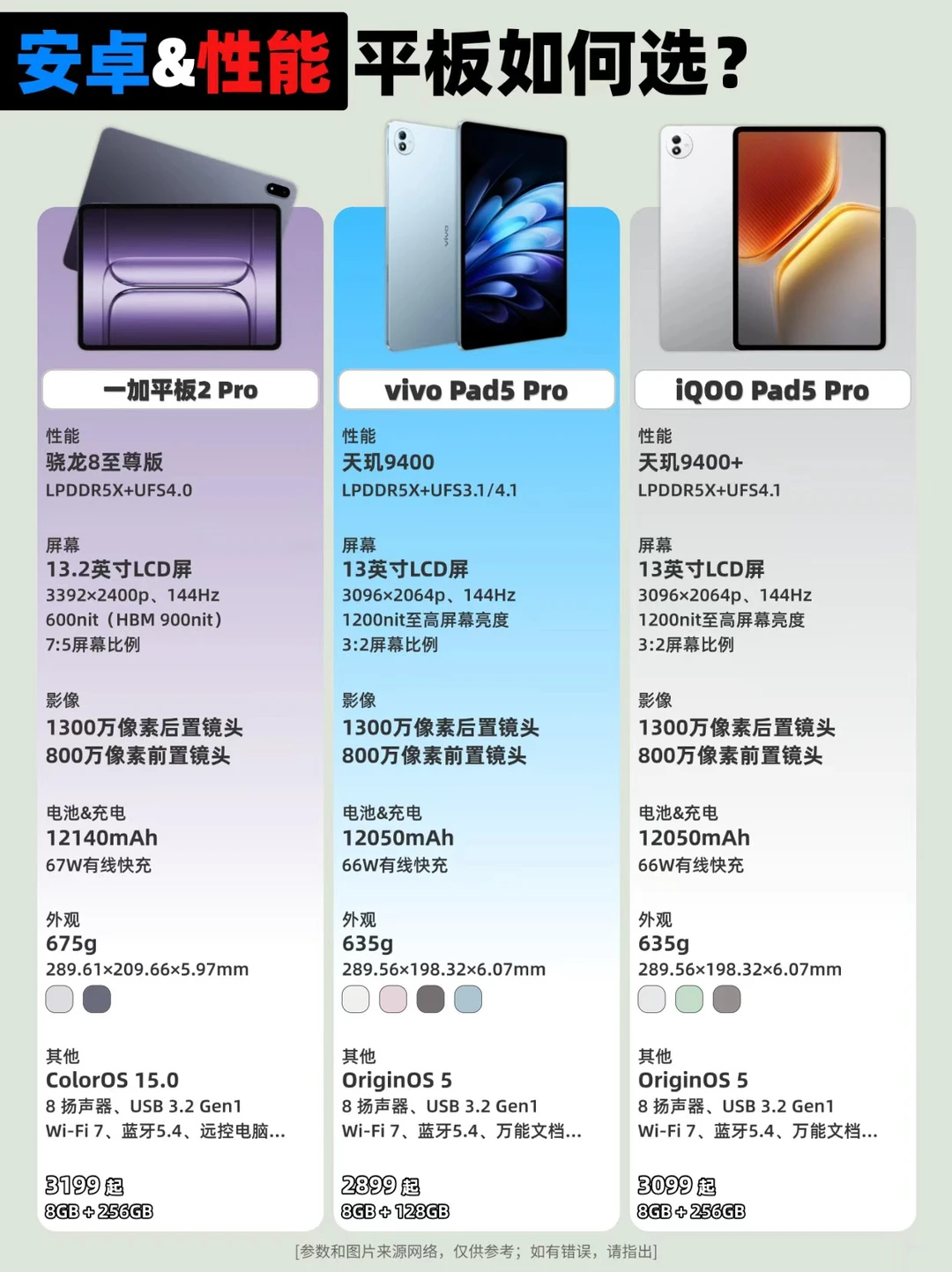之前遇到一些伙伴问到安卓性能平板有哪些,小陈想了一下,主流品牌的话其实选择还挺多的,那这些平板应该如何选呢? 📱OPPO Pad5 OPPO Pad5算是一款比较均衡的“水桶机”,性能、屏幕、续航和互联体验上都没有明显短板,ColorOS 16系统在多任务处理上表现流畅,即使有轻办公需求也有配套的PC级WPS,如果你使用的是OPPO手机,那跨屏协助会比较方便。当然,这个平板当前也比较适合追求性价比的伙伴。 📱荣耀MagicPad3 Pro 荣耀MagicPad3 Pro搭载的是骁龙8 Elite Gen5处理器,性能强悍,配合13.2英寸3.2K 165Hz大屏,无论是处理复杂任务、玩大型游戏还是影音娱乐,体验都不错。其AI办公功能对商务人士也比较友好。 📱小米平板8 Pro 小米平板8 Pro的特色在于WinPlay引擎,可以运行一些PC游戏,拓展了娱乐可能性。如果你是小米手机用户,澎湃OS的生态联动也会带来便利。 📱一加平板2 Pro 一加平板2 Pro和OPPO同属一个生态,核心体验相似。它的优势在于那块13.2英寸的3.4K大屏,视觉冲击力比较强。其O+互联功能对苹果设备用户也比较友好,支持便捷的文件互传。 📱vivo Pad5 Pro &📱iQOO Pad5 Pro vivo Pad5 Pro和iQOO Pad5 Pro这两平板区别不大,只在性能上有小小区别,用都是OriginOS 5系统,除了性能较为强悍外,该平板的AI功能,如AI生成PPT等,可以有效提升创作效率。 对于以上平板,你觉得怎样呢,是否满足你的使用需求?