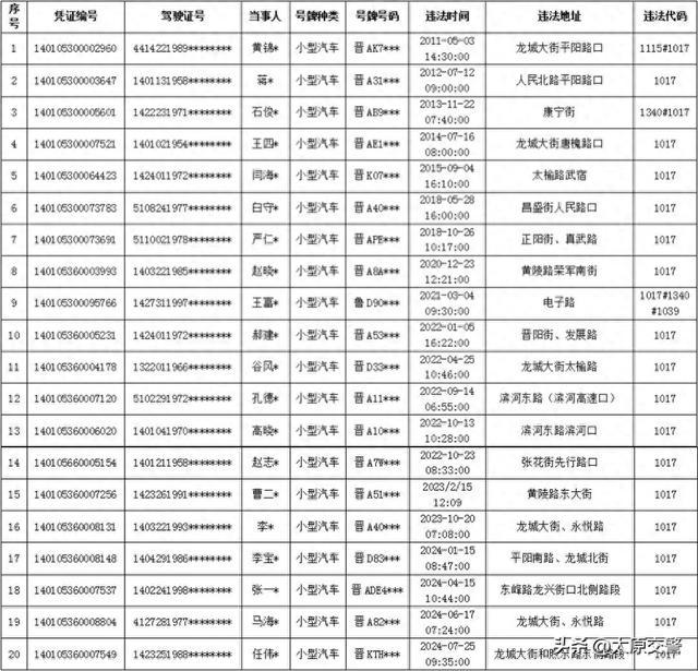 下列20名驾驶人因涉嫌未按规定投保机动车交通事故责任强制保险的违法行为,被太原市公安局交通管理支队一大队(原小店一大队)依法查扣。违法行为事实清楚,证据确实充分,依法应当予以行政处罚,经多次联系当事人催促处理,当事人拒不接受处理。根据《公安机关办理行政案件程序规定》第一百六十八条之规定,现将拟作出行政处罚决定的事实、理由、依据进行公告告知。