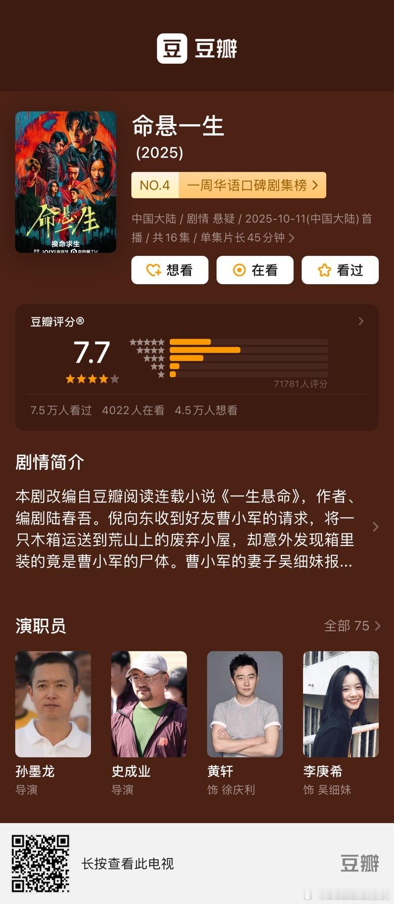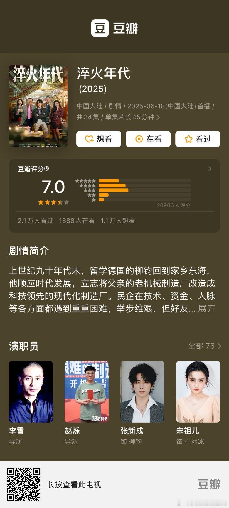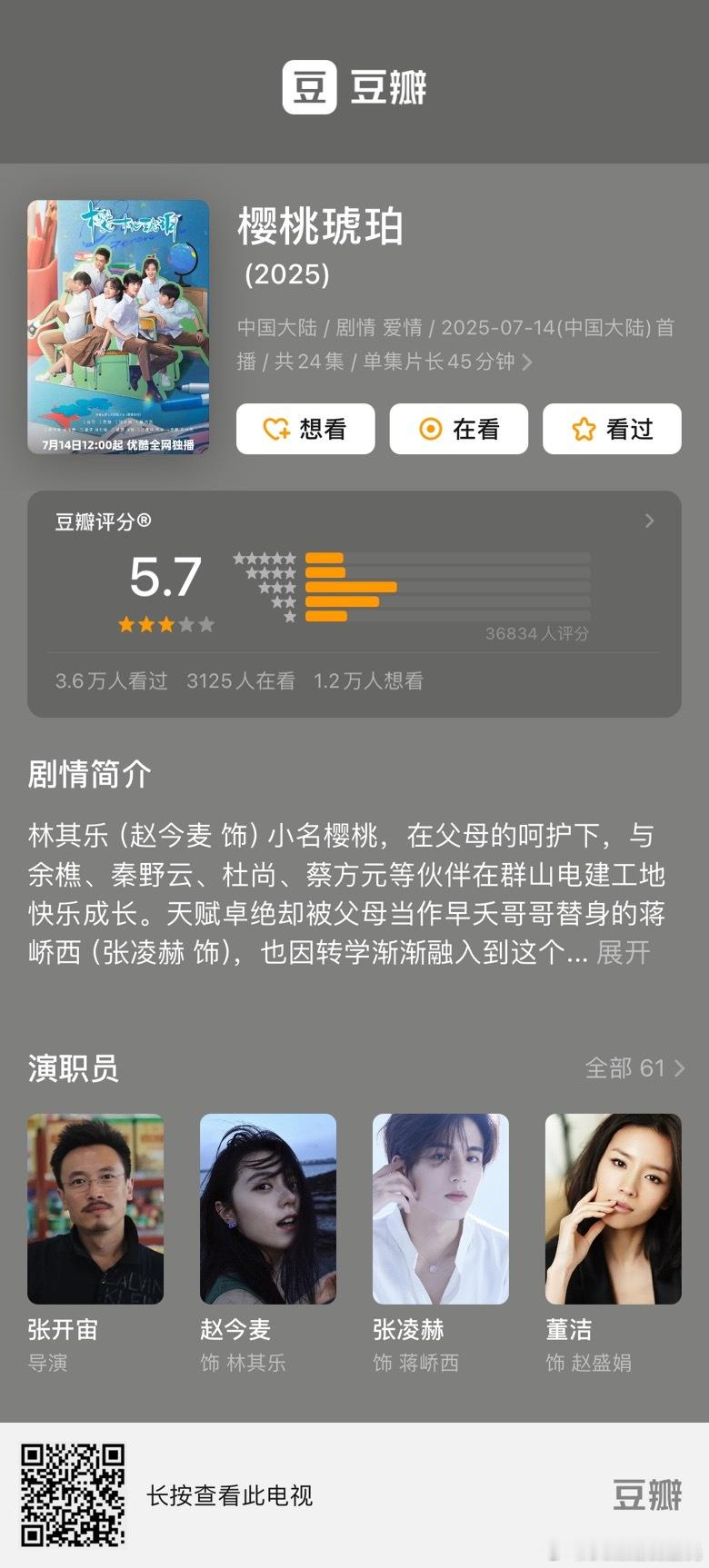 刚才群里盘点了一下,正午阳光今年全扑,可怕,品质大部分还行……优酷:樱桃琥珀 张开宙爱奇艺:命悬一生 孙墨龙鹅桃:淬火年代 李雪也就去掉芒果TV的《小巷人家》(张开宙)口碑数据都不错。