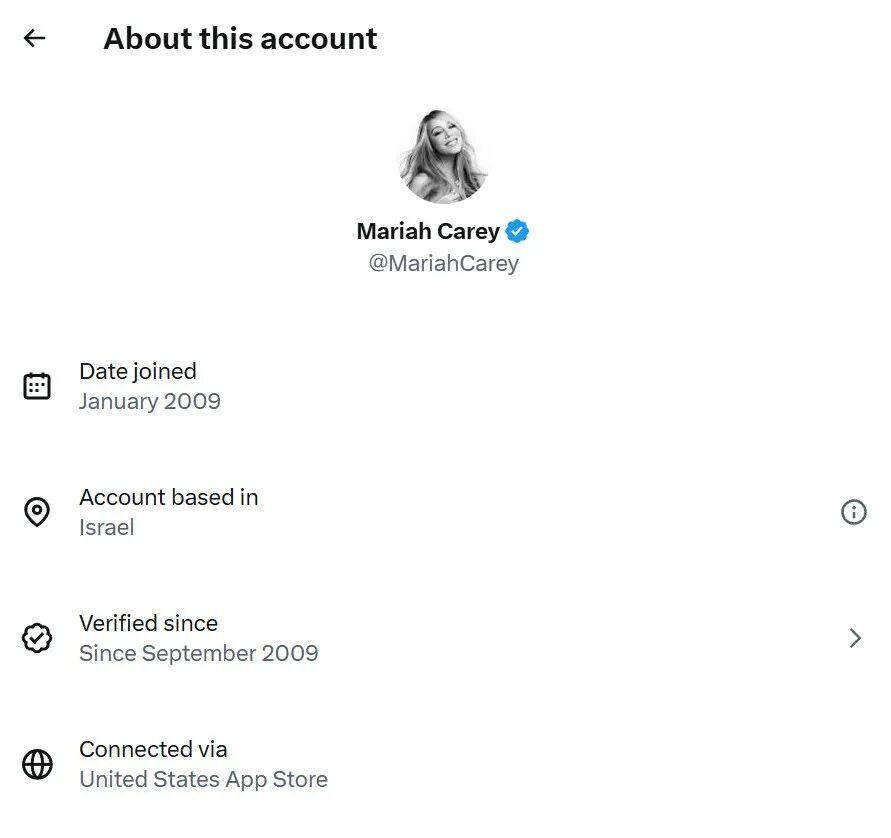 最近,海外社交媒体平台如 X 开始推行“溯源系统”,强制公示用户IP地址和账户注册地信息。这一举措旨在提升透明度,打击虚假账号和网络操纵,但也引发了隐私争议。 而最受瞩目的是 Mariah Carey 疑似被犹太资本入局,账号全权由以色列公司管理! 从X平台的技术标签来看,她的X账号并非在美国本土运营,而是以色列的服务器。 据公开信息显示,Mariah Carey 的账户运营地为以色列(Account based in Israel)。 Mariah Carey 疑似被犹太资本入局。