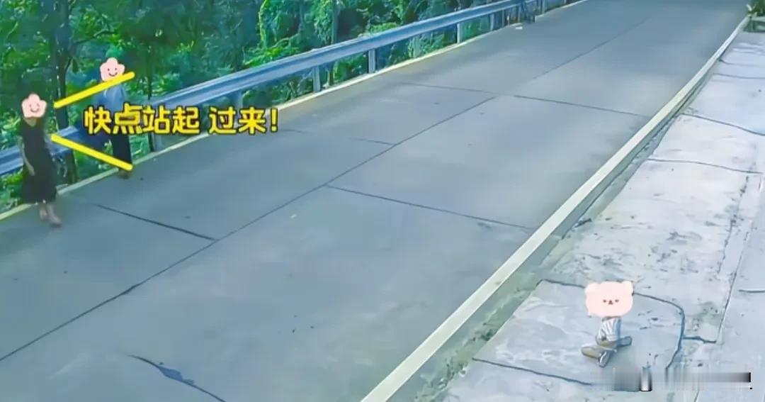 一对父母站在路边,把两岁的孩子放在马路对面,妈妈招手让孩子过来,孩子吓得坐在地上