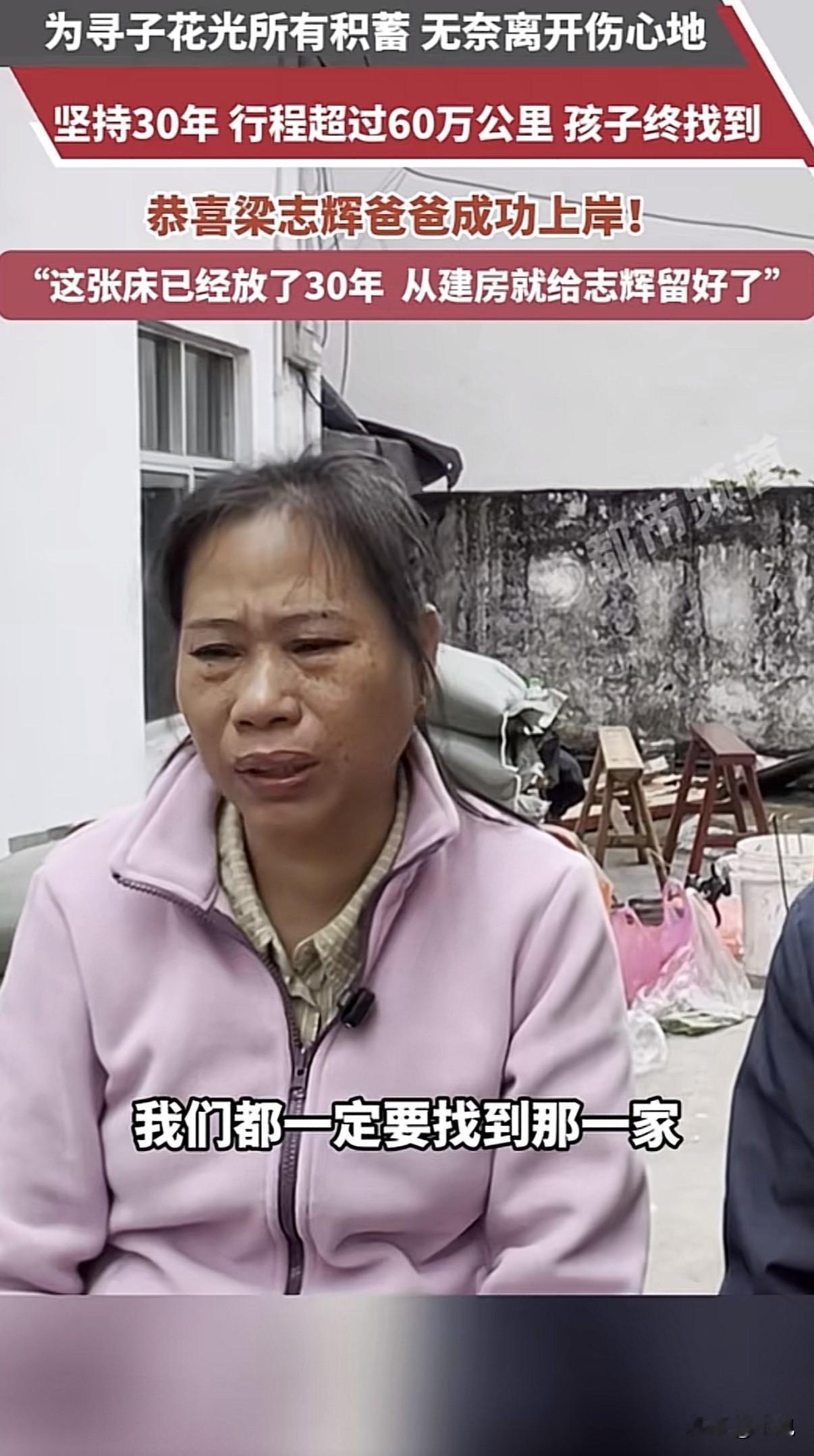 30年,60万公里,终于等到这一天。 1995年9月27日,厦门湖里区一间出租屋里,梁三寿转身做饭三分钟,两岁八个月的儿子梁志辉就不见了。这孩子会说普通话、客家话,还能听懂闽南语,特别聪明。谁也没想到,这份聪明成了后来寻亲的唯一线索。 从此,这个家就变了。 夫妻俩跑了23个省200多个城市,行程超过60万公里,相当于绕地球15圈。穿破40多双鞋,为了省钱睡车站、啃馒头。有一次遇上抢劫,梁三寿死死护住寻人启事,哭着喊:“别抢这个,我在找孩子。” 家里给儿子准备的那张床,三十年都没换过。妻子去广东打工挣路费,丈夫继续寻找。他们说,停下就是背叛。 2020年开始,他们做了17次DNA比对,全都失败了。今年4月有一次疑似匹配,最后又落空。梁三寿说:“心被撕碎了。”参加别人的认亲宴时,他举着祝福的牌子,眼里全是酸楚:“我60岁了,爸爸真的累了。” 转机出现在2025年10月。警方用跨年龄AI人脸识别技术,比对了梁志辉幼年照片,锁定了他的成年生物特征。DNA复核最终确认了身份。 妈妈知道消息后,一整晚不敢睡:“怕又是做梦,不敢睡。” 梁三寿把社交账号名字改成“梁志辉爸爸成功上岸”。他把白发染黑,把房子粉刷一新,等着儿子回家。 梁志辉现在32岁,在广东惠州定居,成了家有了孩子。他主动联系亲生父母:“从未责怪你们。”还叮嘱他们要保重身体。 86岁的奶奶心结解开了,身体也好多了。父母尊重儿子的想法,还没定认亲时间:“30年都等了,不差这一会儿。” 梁妈妈还留着儿子小时候的包被。她说:“就当他在异地发展。” 梁爸爸说,不为养老,只想给母亲和妻子一个交代。 这场跨越三十年的寻找,终于画上了句号。科技让离散的家庭重逢,但那份坚持了三十年的不放弃,才是真正的奇迹。