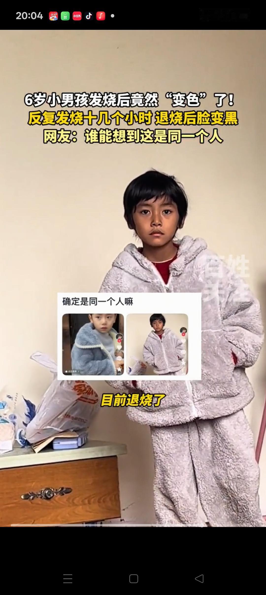 “彻底说不清楚了”,湖南,6岁男孩反复发烧十几个小时后,脸从白色直接变成了黑色。妈妈懵了,说:其他方面都恢复的挺好,就脸太黑了,希望大家能告知怎么样才能变白[捂脸] 看了评论区,不少的网友都有类似的经历,有的过一段时间就恢复了白色,有的就一直是黑色的,只不过会稍微有一点好转。 也有网友说了,这是伤到肾了,一定要去开一点中药,慢慢调理下,不能大意。 作为妈妈也不要太着急,慢慢观察,给他做点好吃的。皮肤能不能变回来不重要,黑一点也不错,长大后有男人味[笑哭] 不知道大家有没有类似的经历,可以分享下吗[what][what]