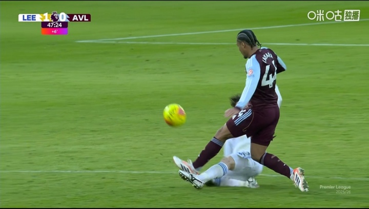 直播吧11月23日讯英超第12轮,利兹联vs维拉,上半场补时第2分钟,田中碧飞铲布巴卡尔·卡马拉染黄!
