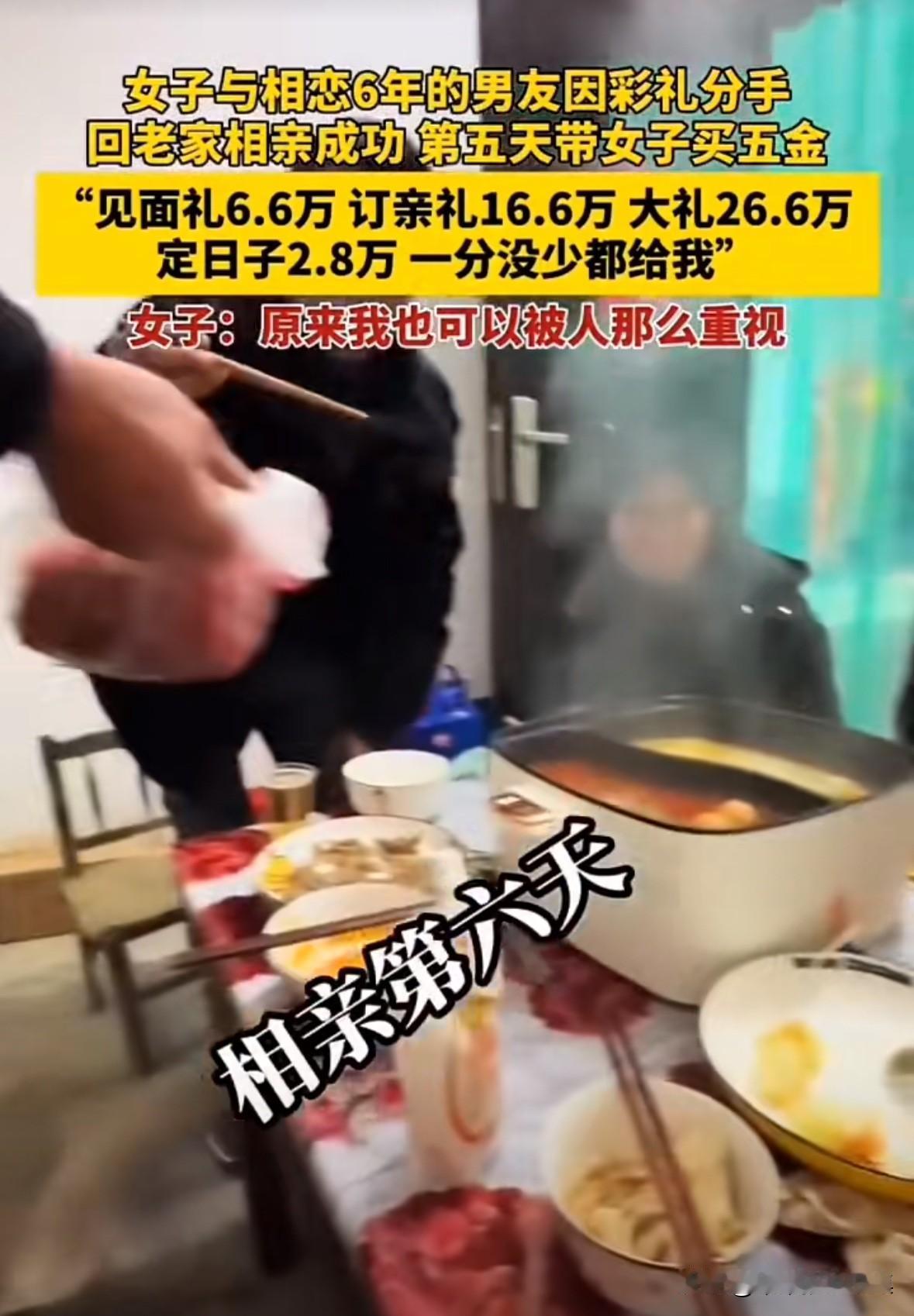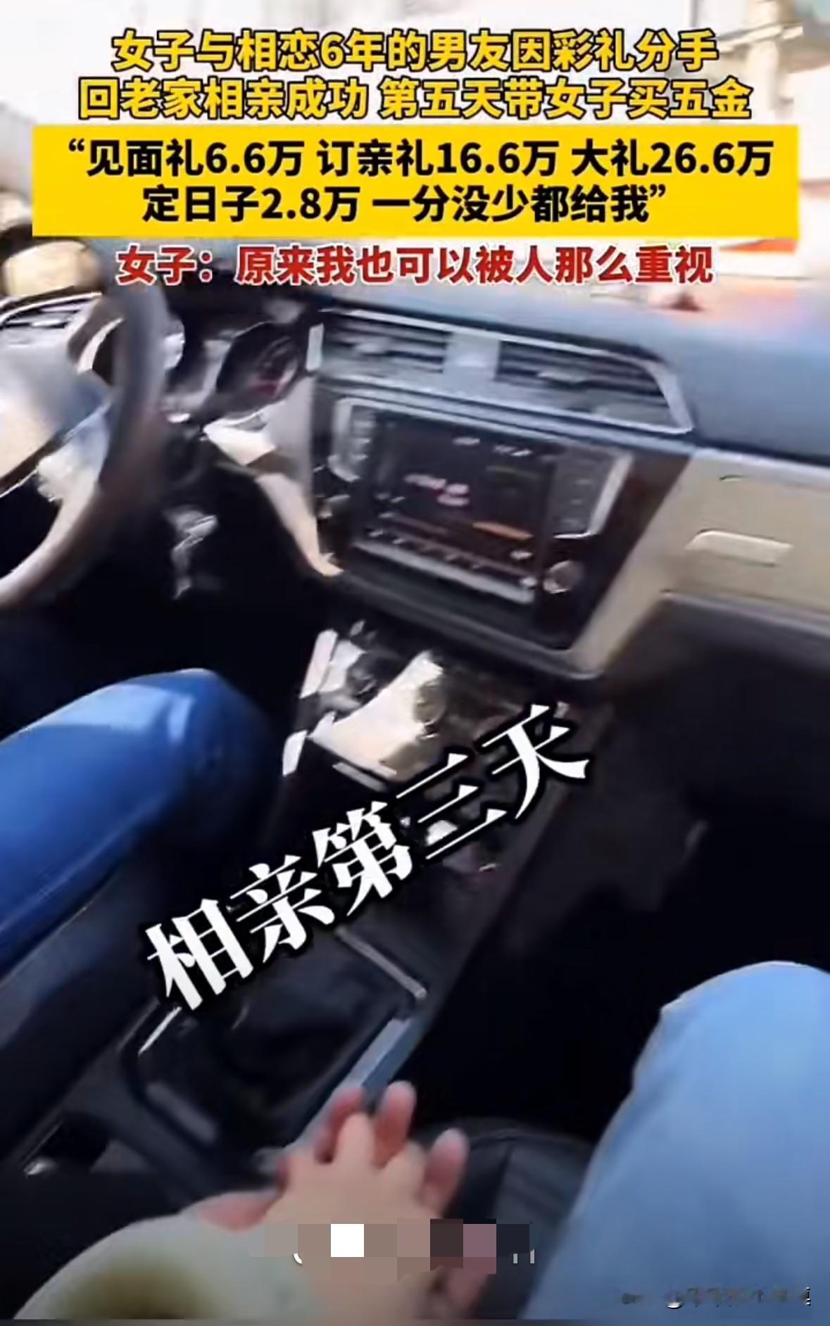 女子因为彩礼跟自己相恋6年的男朋友分手。 回到老家,父母马上给安排相亲。 相亲成功后,男方出手很阔绰,见面礼6.6万,定亲礼16.6万,订婚礼给了26.6万,定日子给了2.6万,一分都没有少给! 女子说:“原来我也可以被人那么重视。” 一个男人跟自己女朋友谈了6年,都给不了她一个家,真是没用,早就该分手了! 不是说女的现实,而是只有钱才能给人安全感,只有男方花钱了,才会懂得结婚不容易,她是我花大价钱娶回家的,我一定要对她好。 有的男的就想白嫖,不花钱就想娶媳妇,才说结婚像是卖女儿。 人家辛辛苦苦养了20多年的女儿,去你家给你生儿育女,以后还要给你照顾一家老小,你花点钱怎么了,就当孝敬女方父母了。 但是大多数彩礼钱,女方都会慢慢的补贴小家,最终还是花到男方家了。女儿定亲彩礼