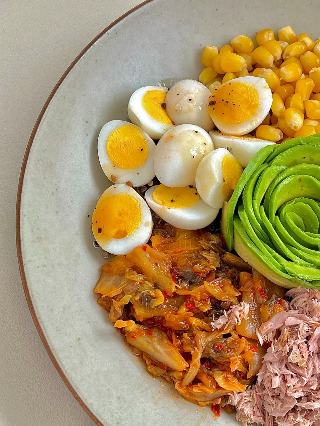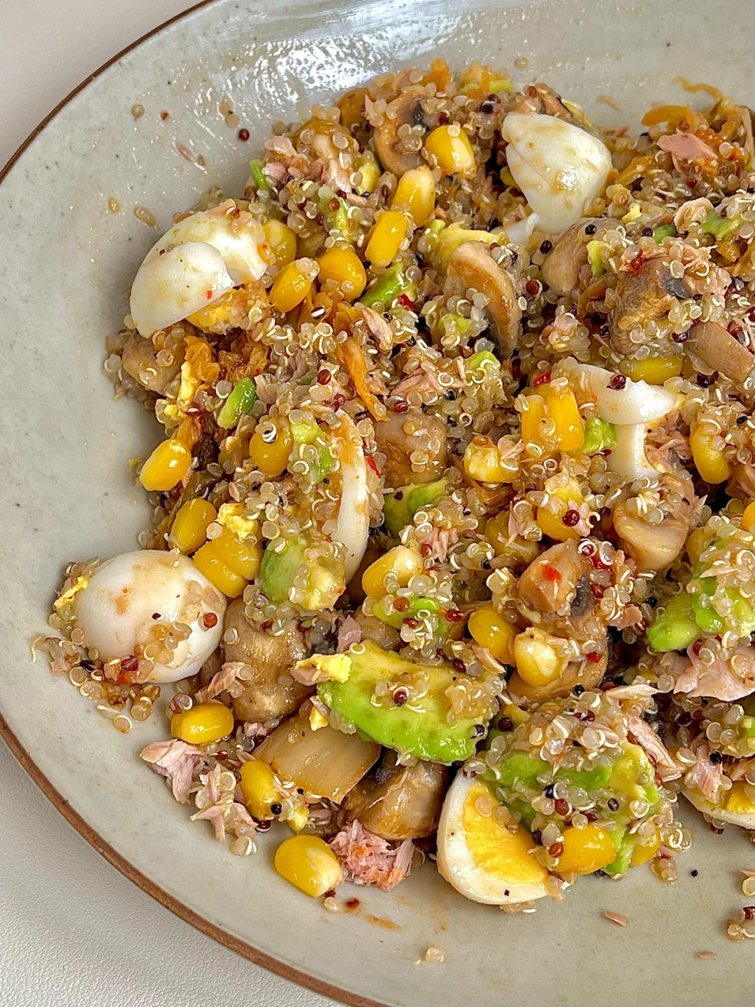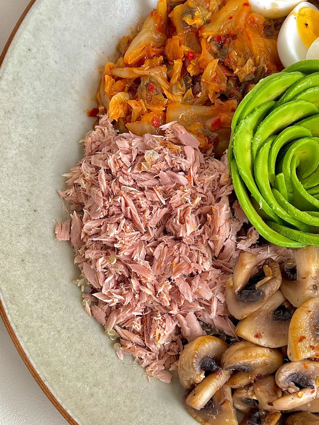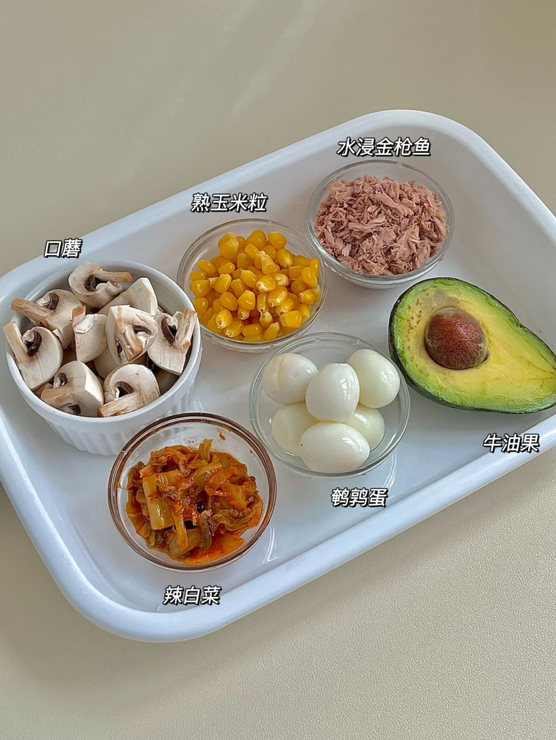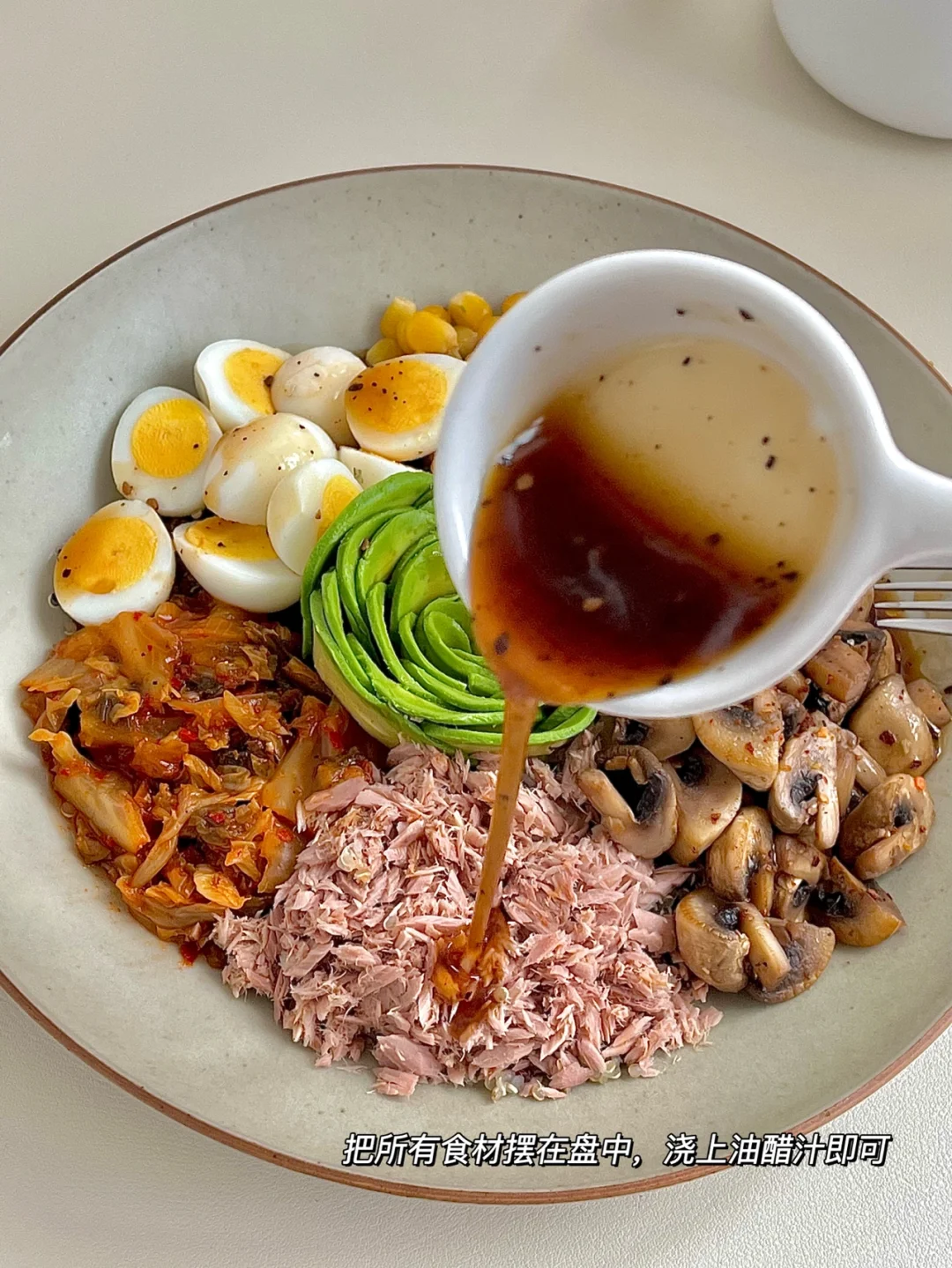好久没吃拌饭了,今天来个低卡的金枪鱼波奇饭,做法简单,又好吃😋 . 🥑食材:牛油果 金枪鱼 玉米粒 口蘑 鹌鹑蛋 辣白菜,煮好的藜麦饭。 🥑做法:玉米粒焯水,口蘑用橄榄油炒熟,鹌鹑蛋煮熟切开,水浸的金枪鱼沥干水份,所有食材摆在盘子上,最后浇上油醋汁就可以了。真的真的巨好吃,这些食材你可以换成别的,我觉得怎么搭配都好吃,低脂高蛋白健康饱腹😋