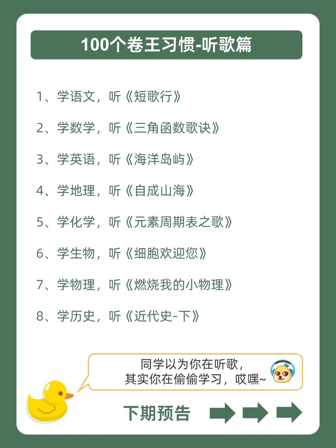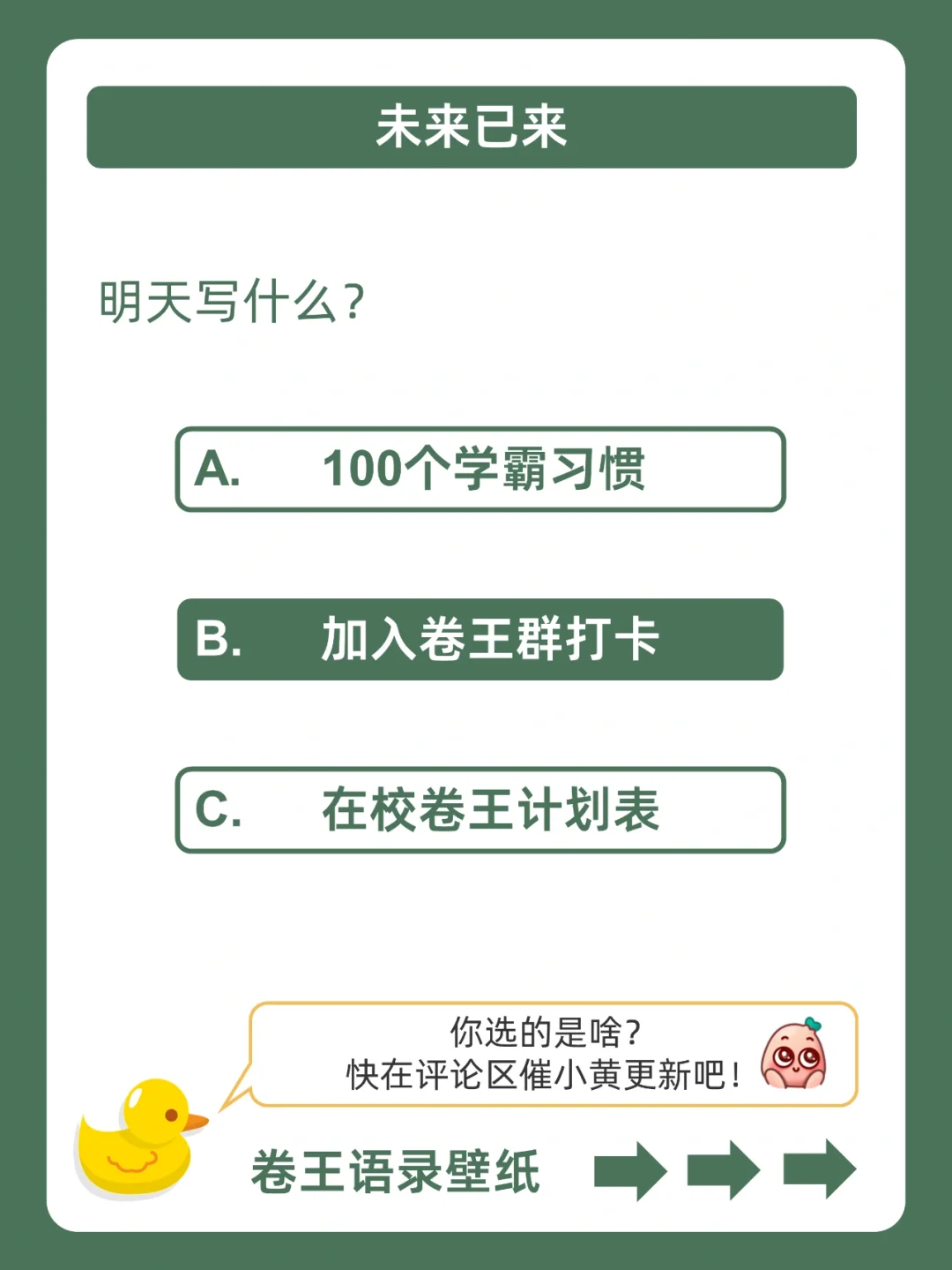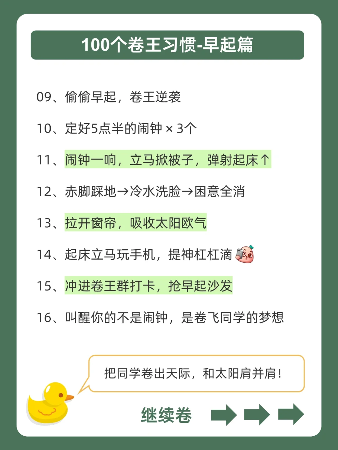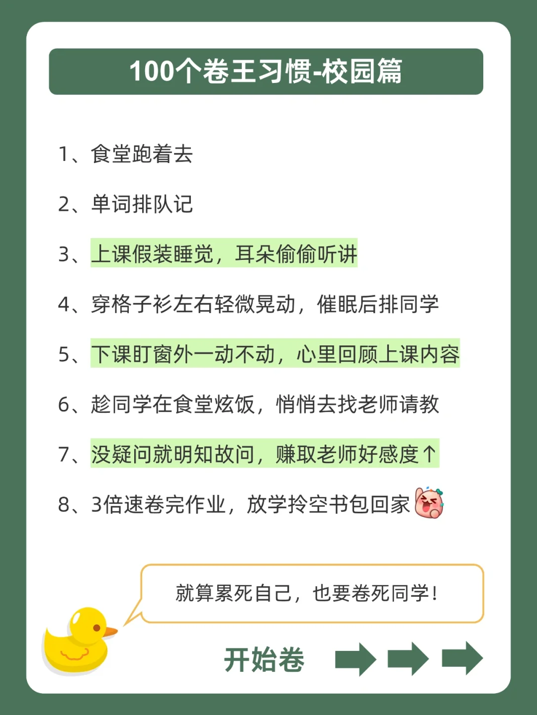 . [赞R]帮你逆袭学霸,是小黄的责任❗ . [向右R]有同学一直在蹲在校生的卷王习惯,蹲得腿都麻了![石化R] . [飞吻R]小黄学长这么宠粉,投稿和建议都会认真对待的哇![哇R] . 今天就来分享,100个卷王习惯,都在上面的图,看完就会用!从此卷王学习,逆袭学霸。[赞R] . ️[太阳R]我是小黄,持续更新优质学习笔记,陪宝子们逆袭学霸,叱咤校园![赞R]