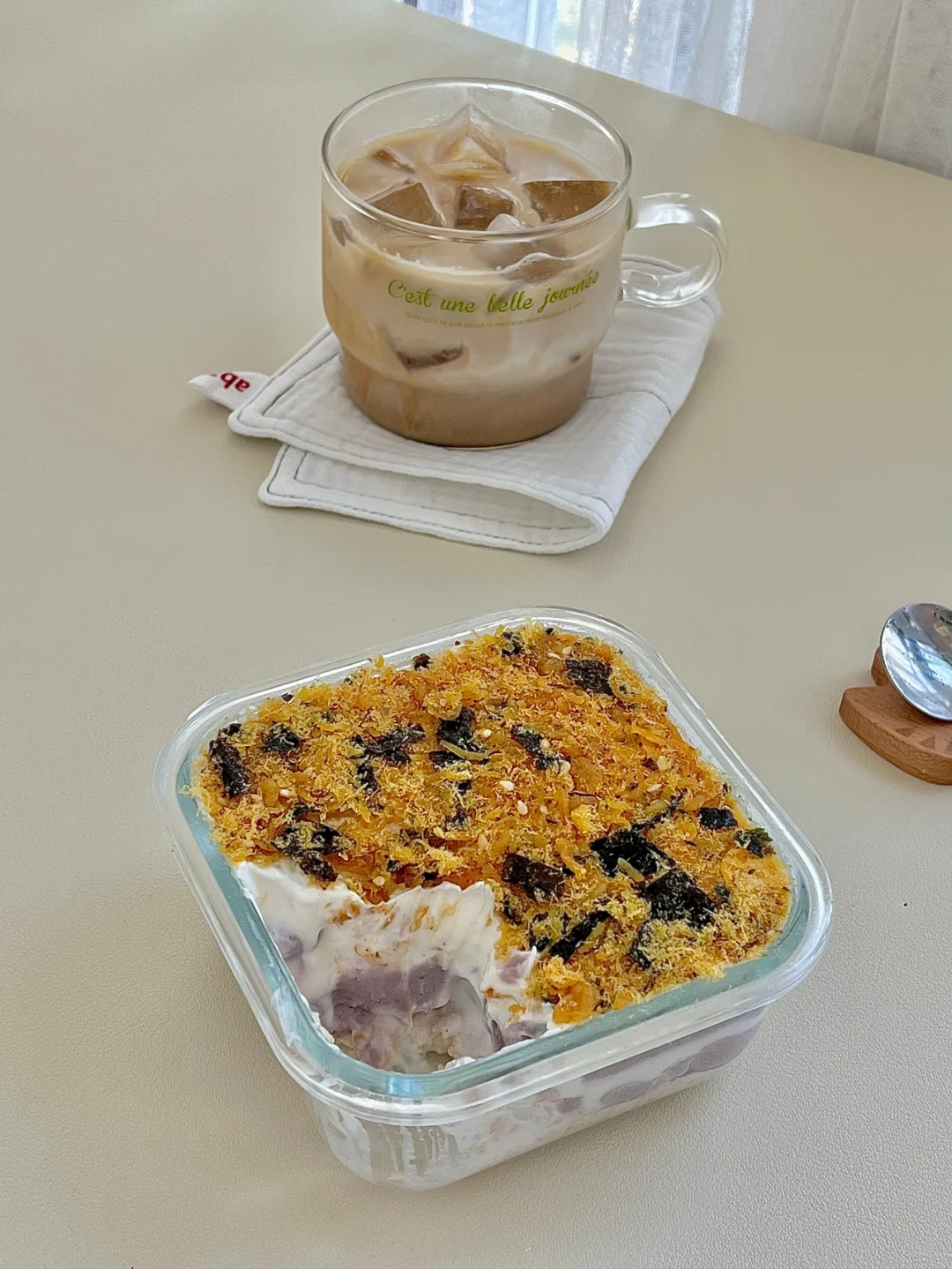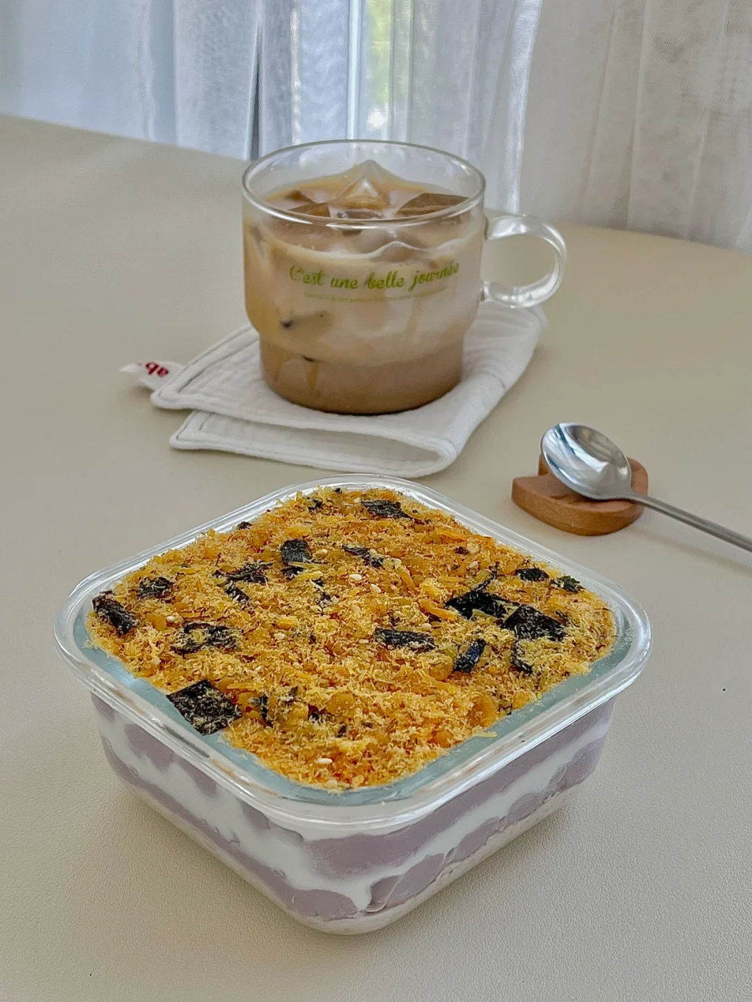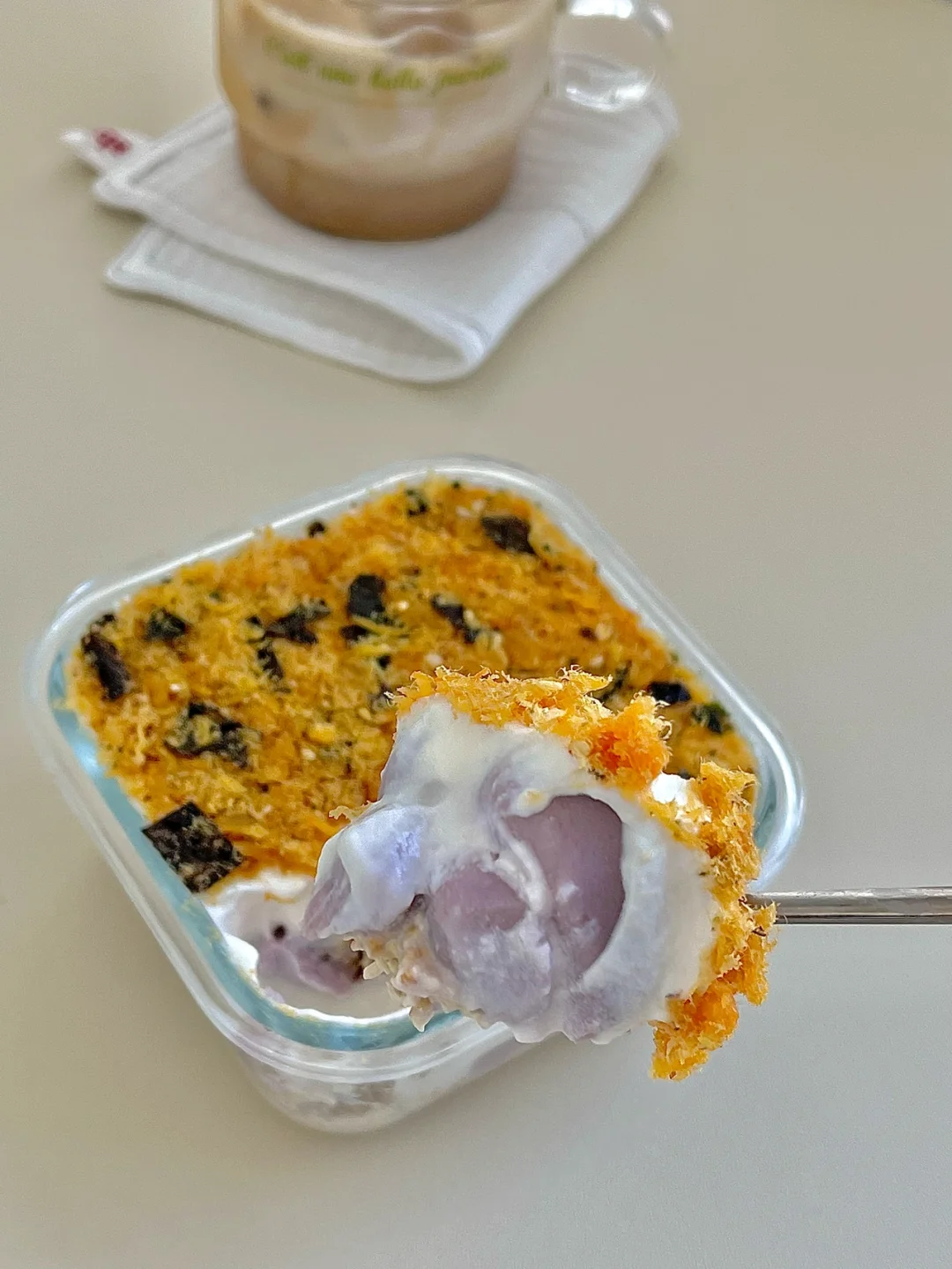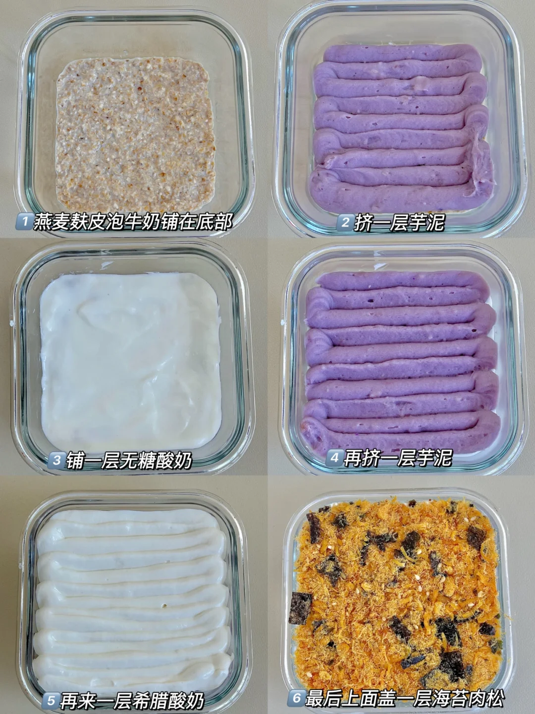 4️⃣挤一层芋泥,铺一层酸奶,再挤一层芋泥,再来一层希腊酸奶,最后上面盖一层海苔肉松。可以放在冰箱冷藏一晚,晚上带去公司吃。
