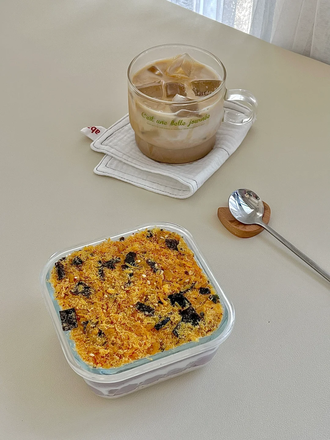 我这个芋泥盒子除了海苔肉松热量高点之外,其他都很低卡,如果不喜欢肉松的可以不放哦。