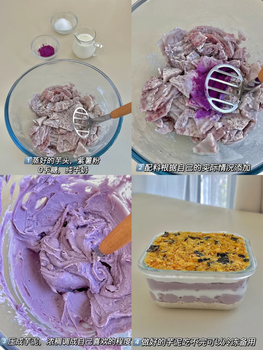 2️⃣蒸好的芋头加入适量的牛奶,紫薯粉,零卡糖压成你们喜欢的浓稠度。可以多做点,用不了冷冻保存下次用。