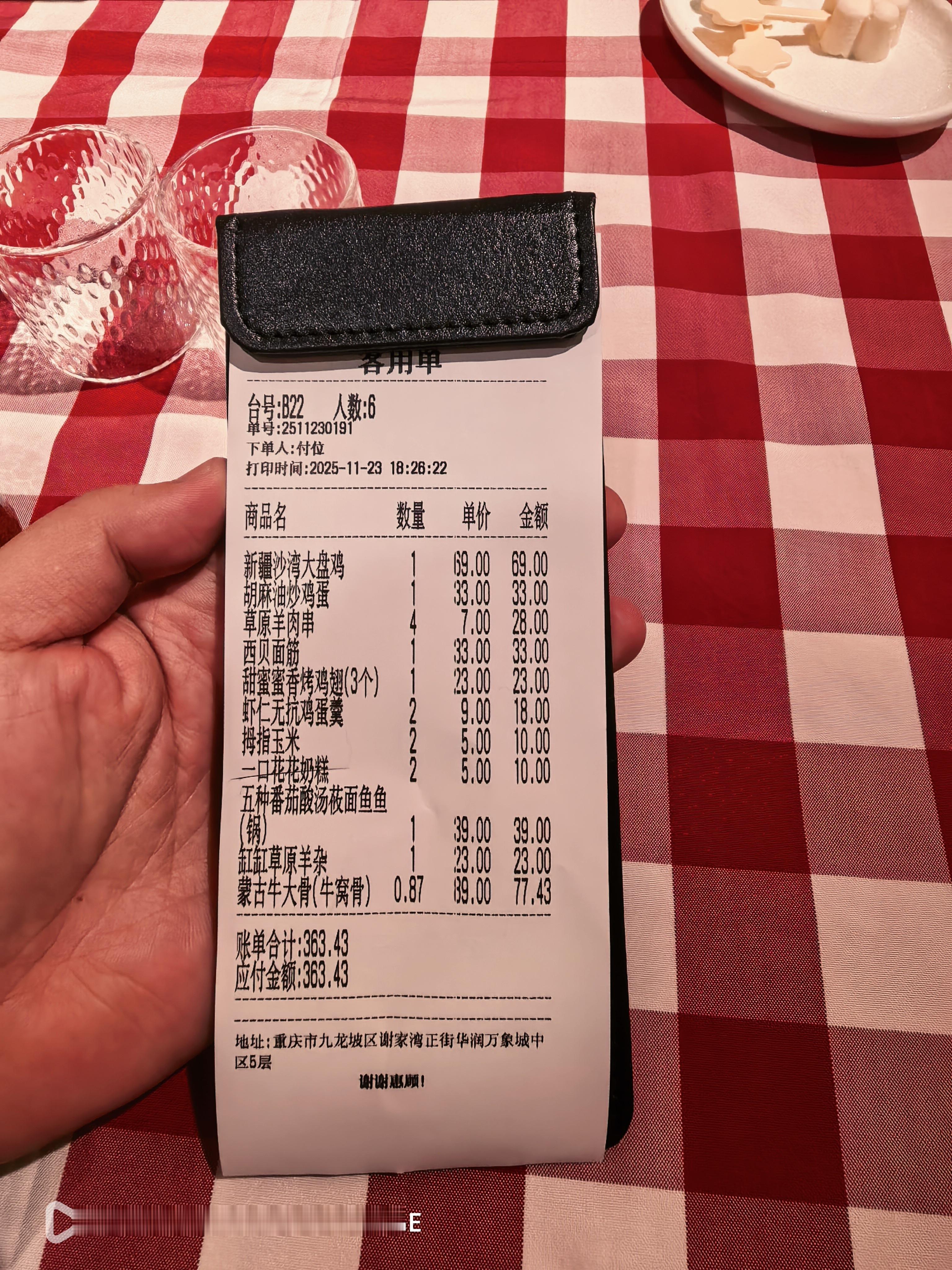 今晚吃西贝…现在6点半,看了一下,店里基本都坐满了,生意还是不错的我坐在位置上的时候,邻桌的年轻人和自己的父母说:这家可以,没有预制菜…如果罗永浩在这家旁边听到这句话,不知道会作何感想?刚点完菜(图三),4大2小,一共花了363,看菜单,你觉得贵还是便宜?