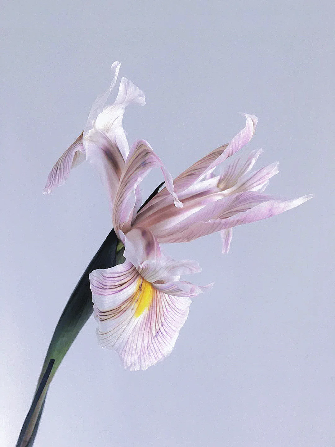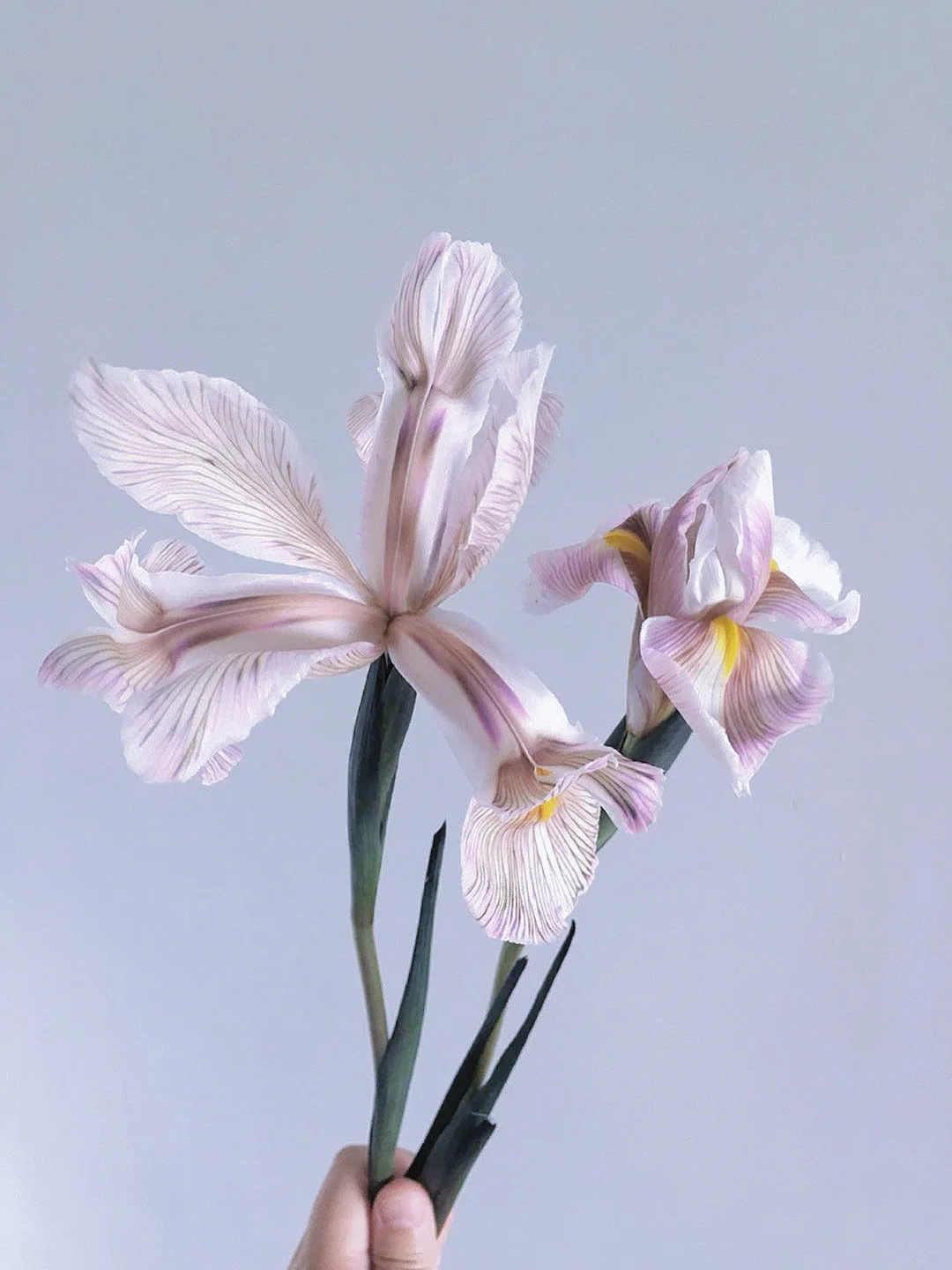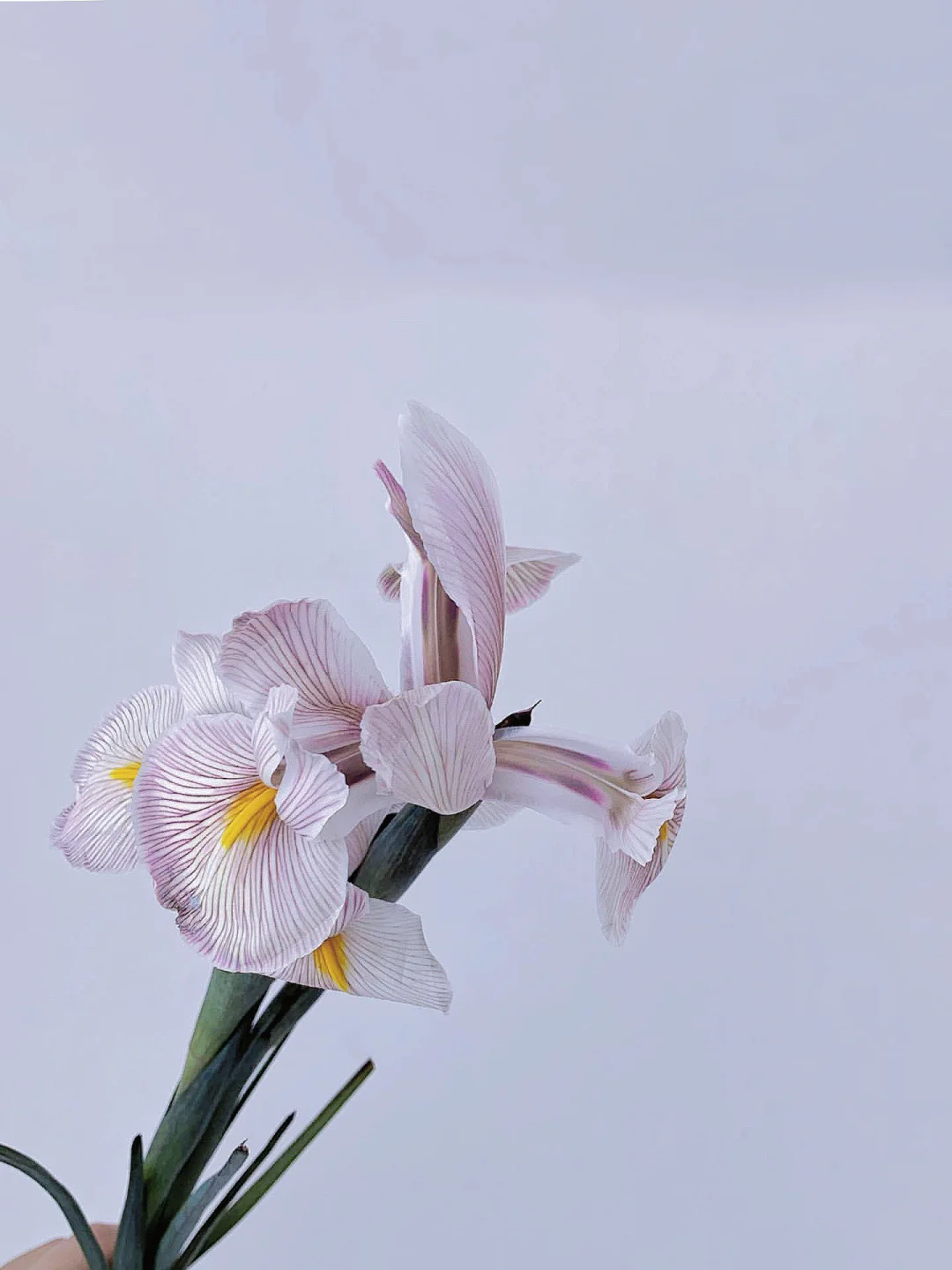 在插花中,鸢尾作为跳跃型花材可以增加作品的灵动性与高级感;