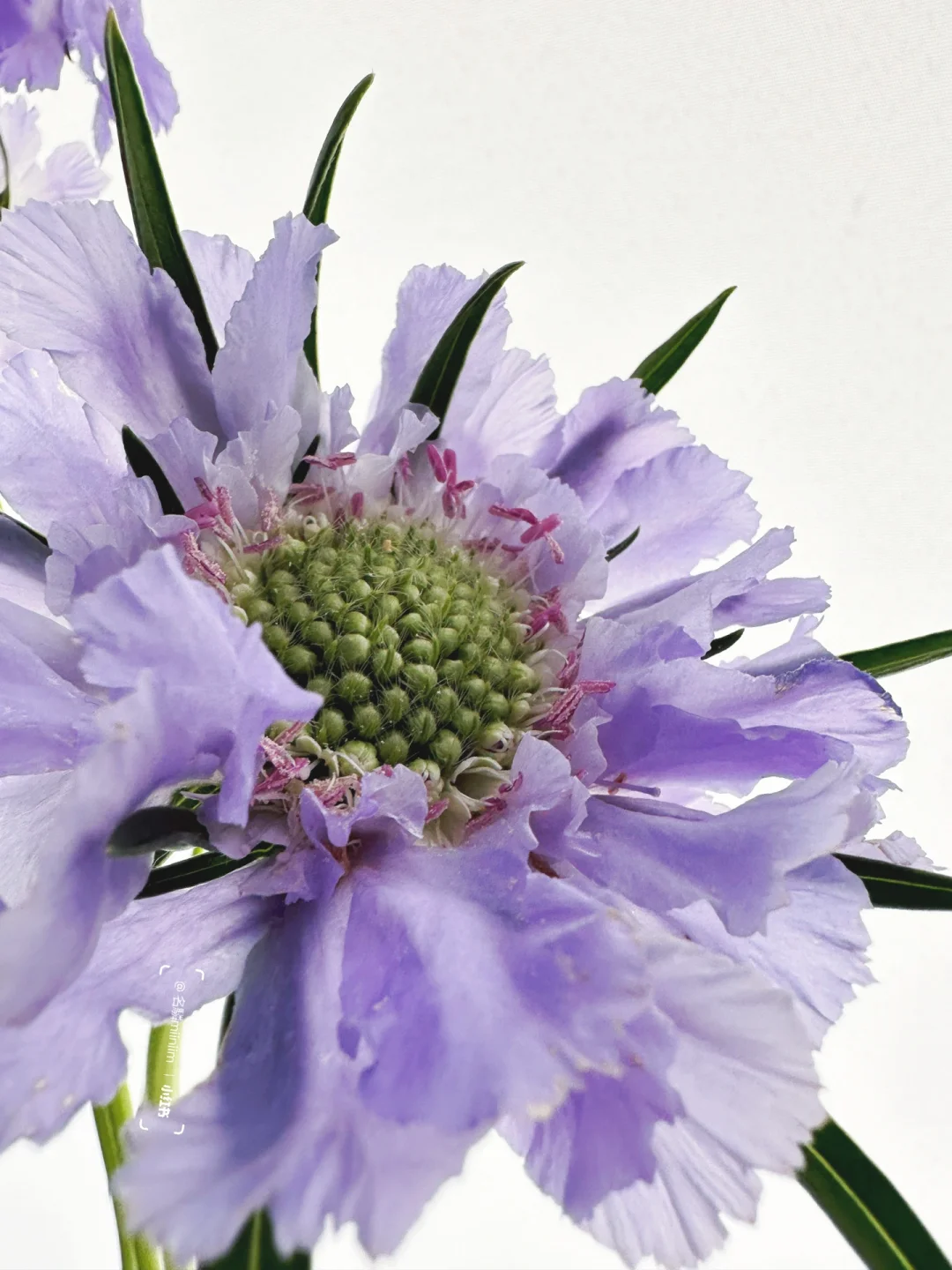 💜花材:蓝盆花 💜别名:轮峰菊 💜花期:鲜切花7-10天 💜花语:追忆、梦想、无法实现的爱情 花瓣舒展,且边缘呈不规则锯齿状,颜色是自然形成的偏蓝的浅紫色,非常独特。凋谢后的果实商品名叫“风车果”,也是非常独特的花材。 💜养护 开放后在运输途中容易受伤,需谨慎挑选,以免在运输过程中损伤 1⃣️换水:每2-3日一次 2⃣️清洗:花瓶清洗干净,擦掉水渍,花杆剪根冲洗 3⃣️水位:花瓶高度1/3,草本植物,浅水位 4⃣️修剪:根部以上2~3cm处45°斜剪 🌈|TIPS|长按自取|感谢喜欢|欢迎分享