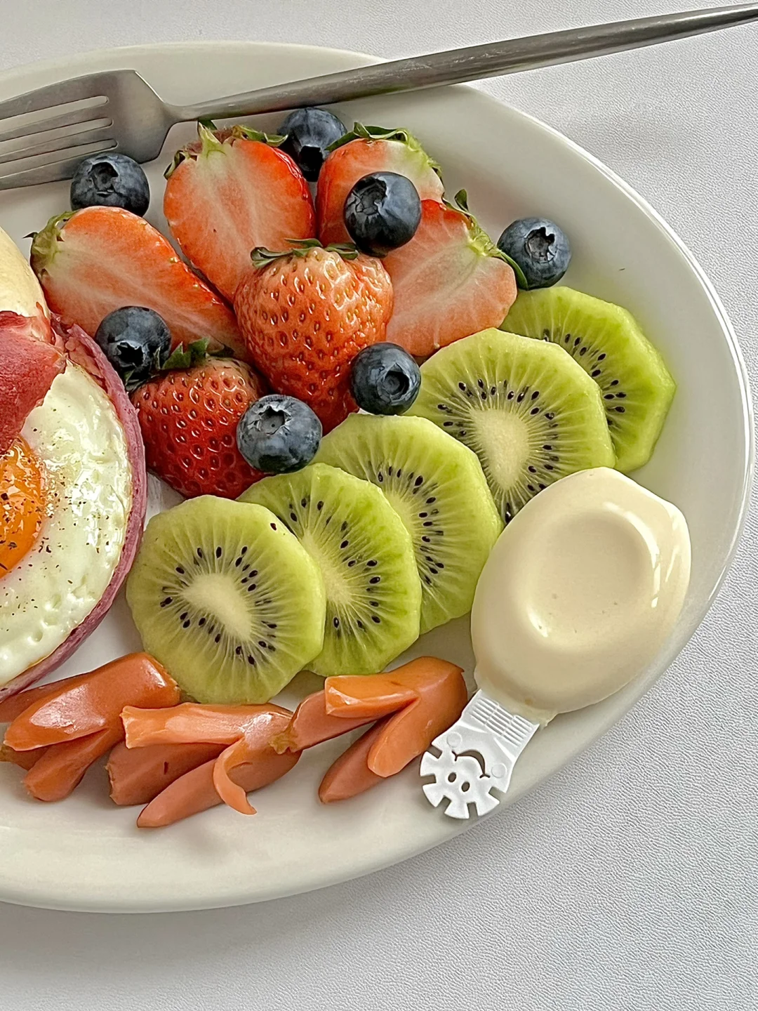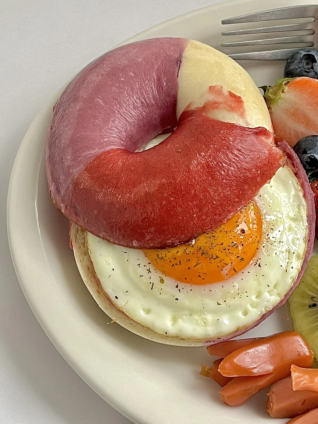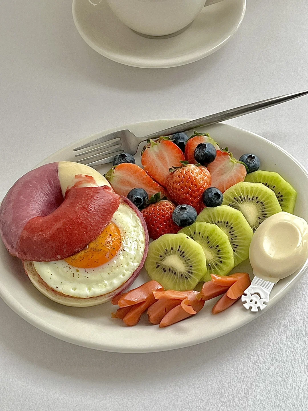 热气腾腾的三餐 今日份早餐分享: 草莓奶酪贝果🥯 煎蛋🍳 草莓🍓蓝莓🫐猕猴桃🥝 煎脆皮肠 奶酪棒 一杯美式☕️ . 周一的早晨应该是彩色,这样就会让不好的心情看到这一份早餐瞬间就有幸福感了❤️ 贝果🥯是线下的一家新开店里面的,还有个好听的名字,星黛露草莓奶酪贝果,口感是那种偏软的,我不太喜欢呢,不过好看就够了! . 新周快乐呀!