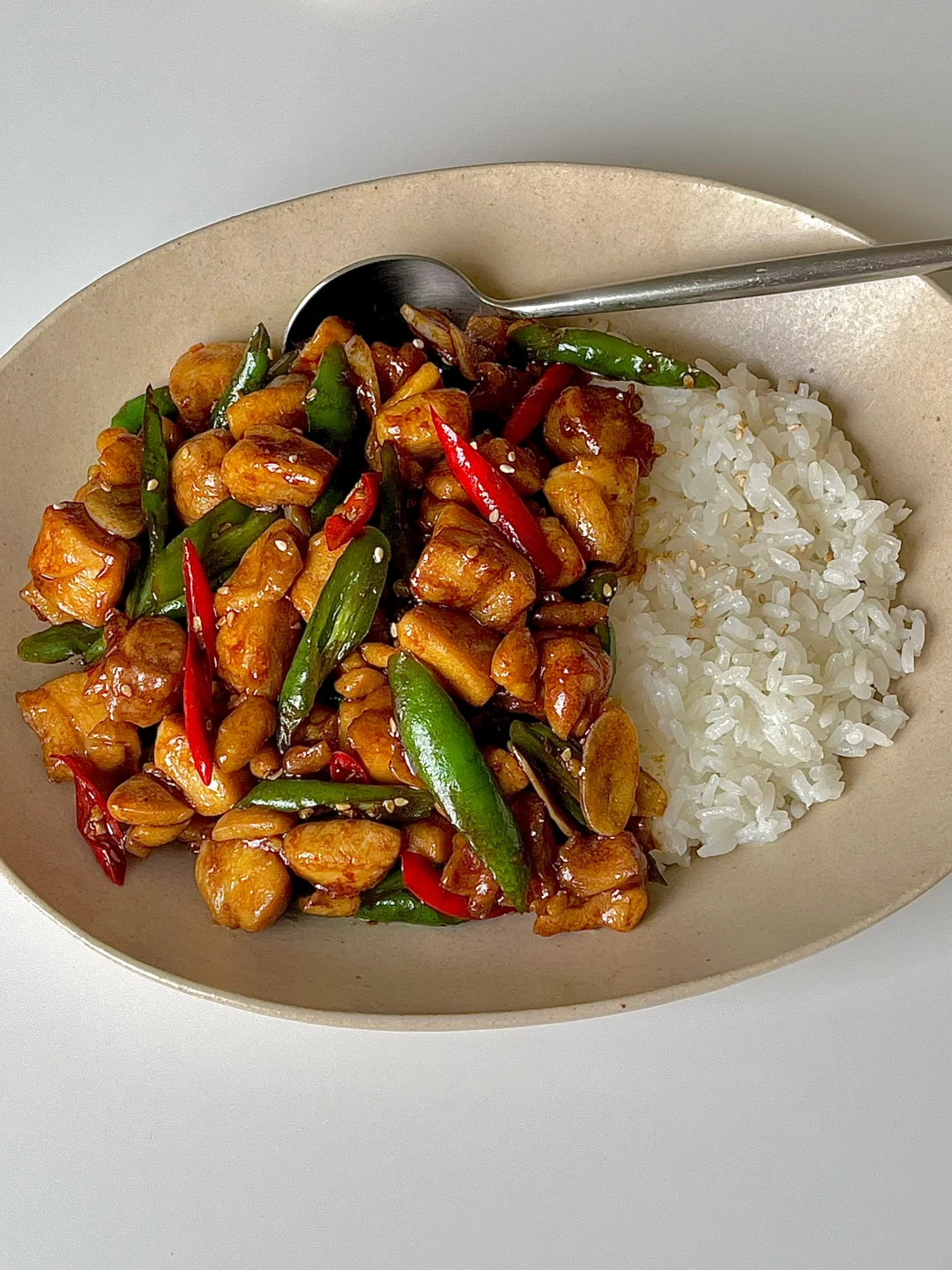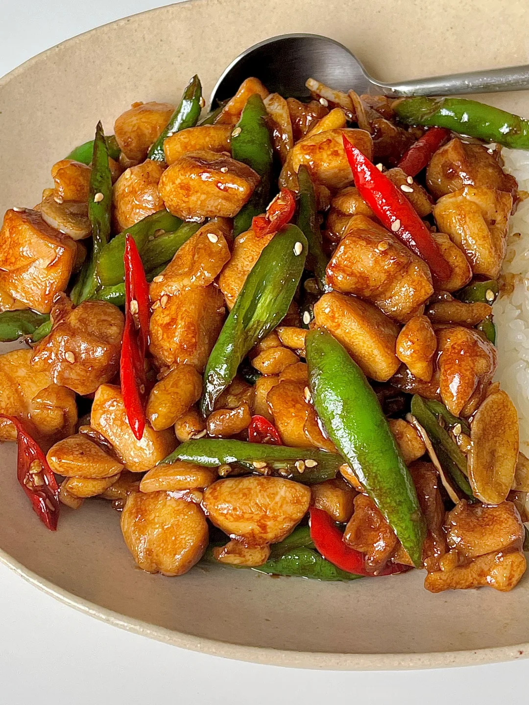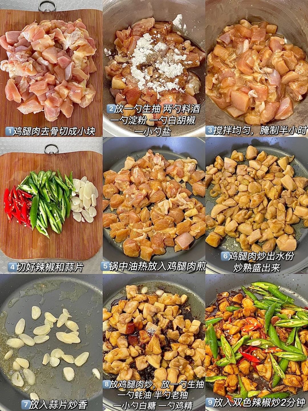 🍗食材:三个去骨鸡腿肉 双色辣椒 蒜片