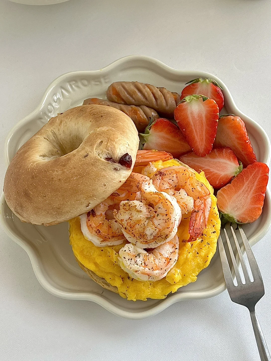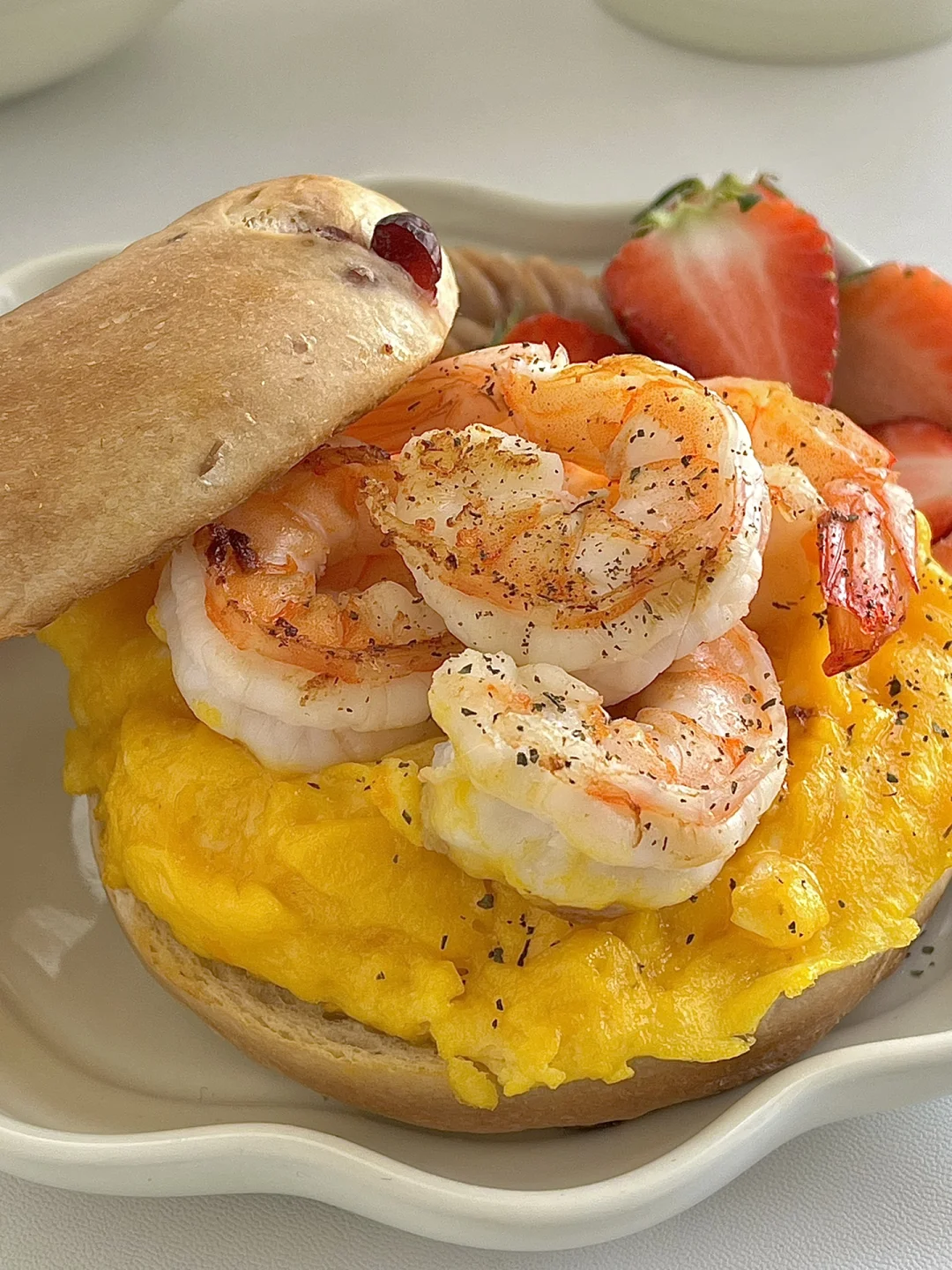 ☀️工作日早餐|滑蛋虾仁贝果三明治&酸奶碗😋