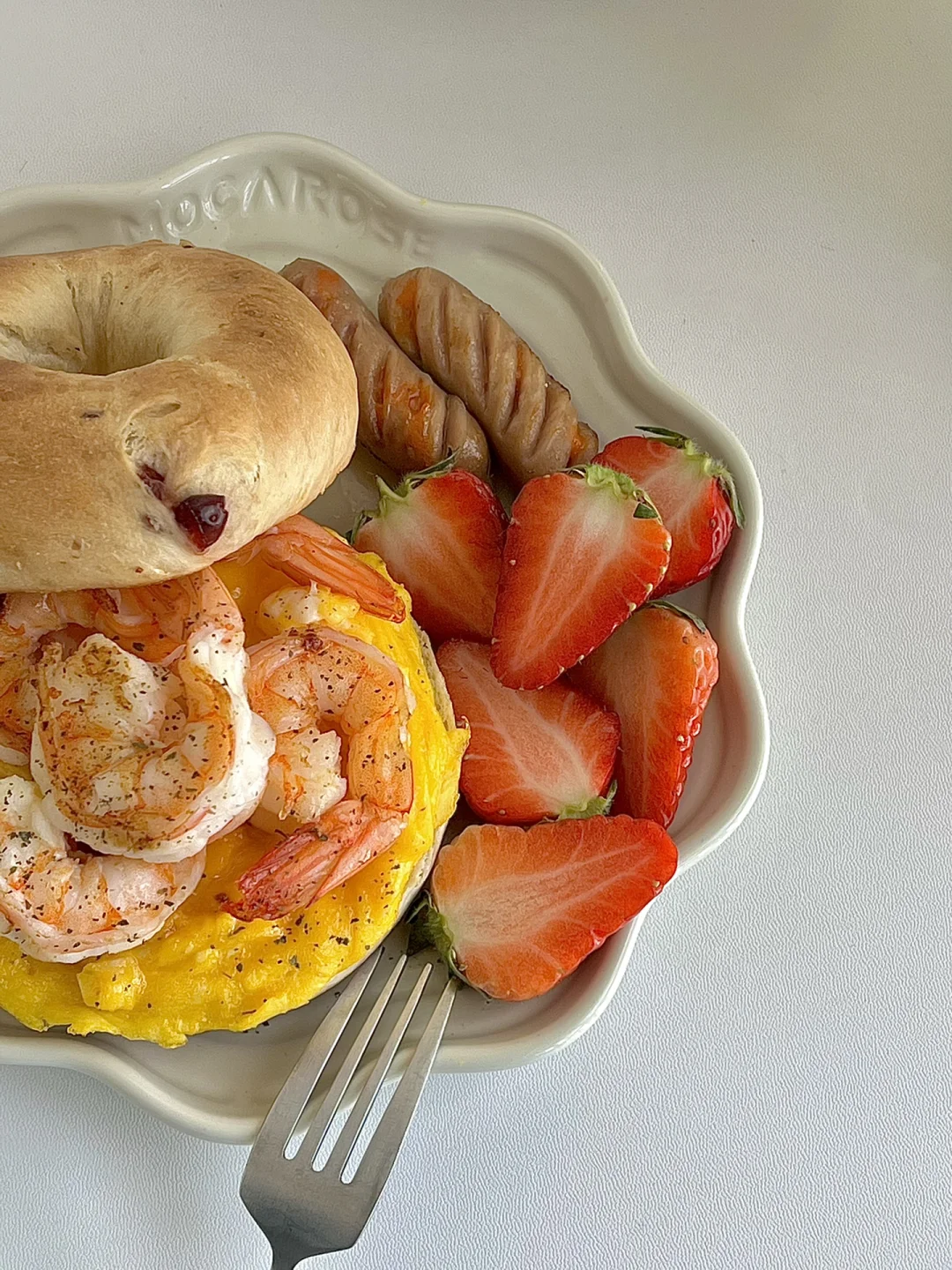 好吃的春游路线 今日份早餐分享: 滑蛋虾仁贝果三明治 草莓🍓 烤芝士芥末香肠 水果酸奶碗 . 今天的酸奶碗颜色好清爽呀,放了香蕉,芒果,芭乐果,蓝莓,椰子片,一点巧克力燕麦片😋 滑蛋虾仁三明治也是经典搭配好吃不腻 . 高颜值的餐具搭配好吃又好看的食物 看着就让人心情愉悦,[派对R]