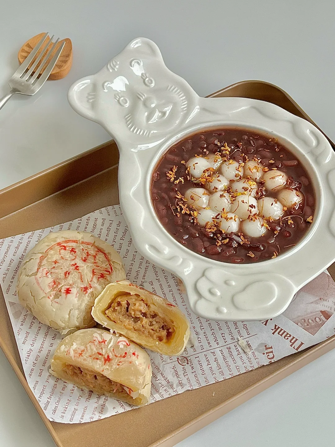 今日份丰盛早餐:糯唧唧的红豆丸子汤,鲜肉月饼。