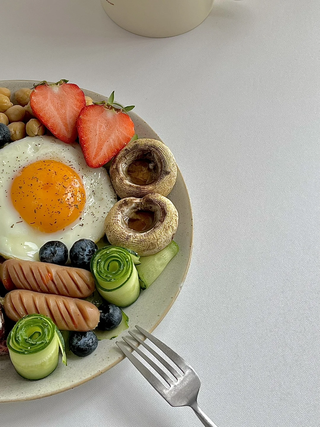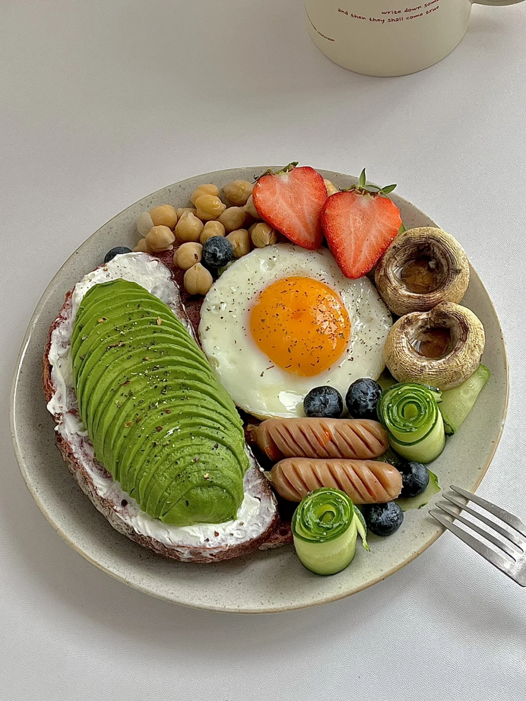 在春天幸福地吃饭 今日份早餐分享: 奶酪牛油果欧包开放式 鹰嘴豆 煎蛋🍳 黄瓜🥒 草莓🍓 蓝莓🫐 煎香肠 烤口蘑 一杯美式☕️ . 今天的早餐有点丰盛呀😋 把盘子塞得满满的才满足