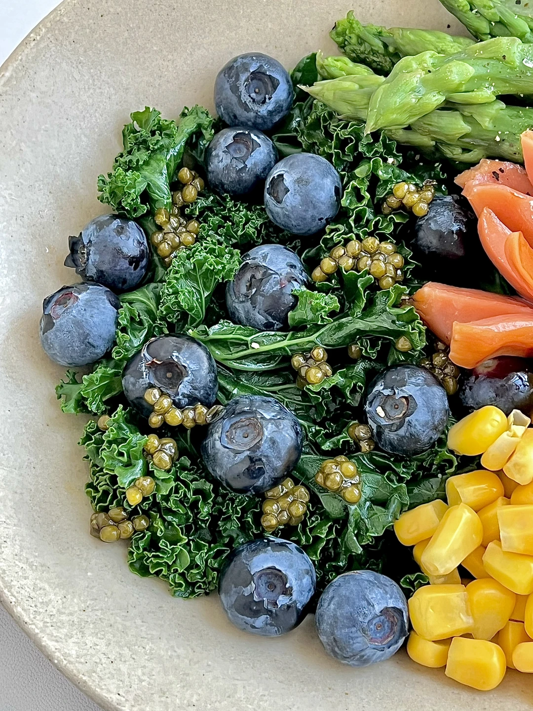 一人食吃什么 今日份早餐分享: 芦笋虾仁鸡蛋玉米香肠沙拉🥗 一杯美式☕️ . 1️⃣芦笋切成小块,水开放进去,放一勺盐几滴油,这样颜色会很好看。 2️⃣再把羽衣甘蓝放进去烫个十几秒捞出。 3️⃣煮个水煮蛋(水开煮7分钟)把虾仁和脆皮肠煎熟 4️⃣玉米粒是熟的甜玉米。 5️⃣最后摆盘,羽衣甘蓝上来点蓝莓和鱼子酱。 . 羽衣甘蓝做沙拉我觉得还是烫一下比较好,要不然我吃不下去😂。 最近爱上各种沙拉,真的是快手又低卡😋
