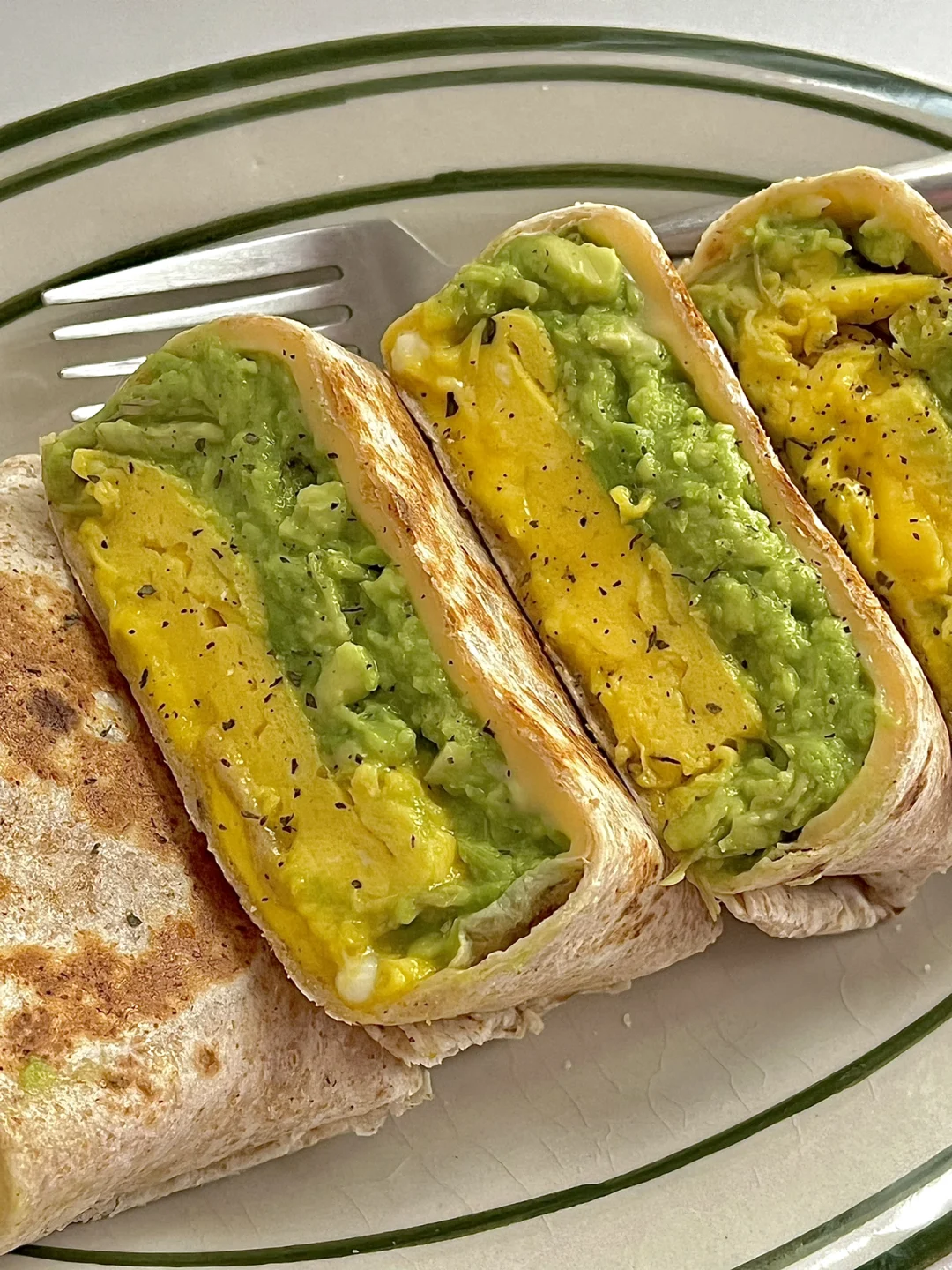 🌯食材:两张全麦饼皮 两个鸡蛋 牛奶适量 一个牛油果 两片芝士 海盐黑胡椒