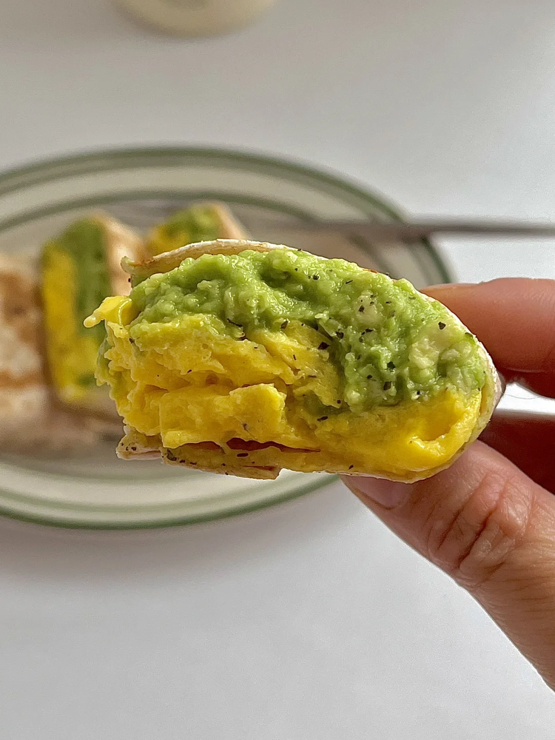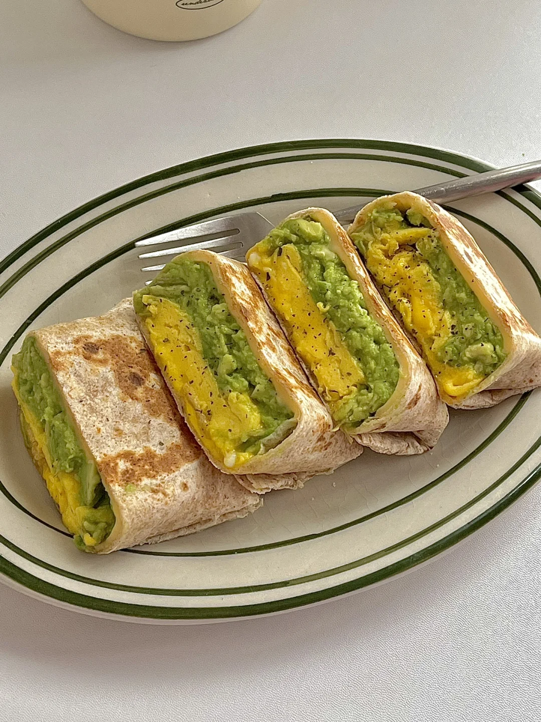 剩下两张饼皮,还有一个很软的牛油果,做一个经典搭配的卷饼。吃了两个就饱了,剩下两个就当我的晚餐了!满足😋
