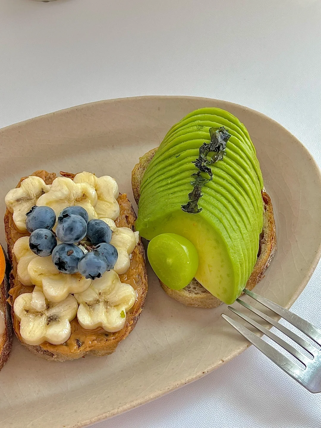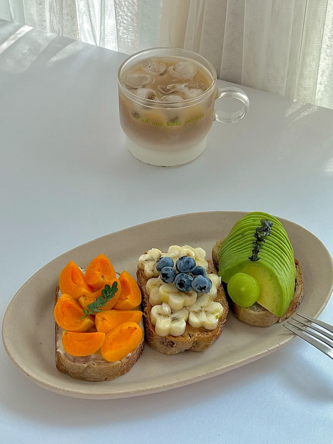 今日份早餐分享: 奶酪甜杏法棍开放式 花生酱香蕉蓝莓法棍开放式 牛油果法棍开放式 一杯冰拿铁☕️ . 工作日不开火的简单早餐。这几天又是高温天气,还是多吃点水果吧,开放式三明治就是好搭配,自己喜欢怎么搭配就怎么搭配。猜我最喜欢的是什么口味的?
