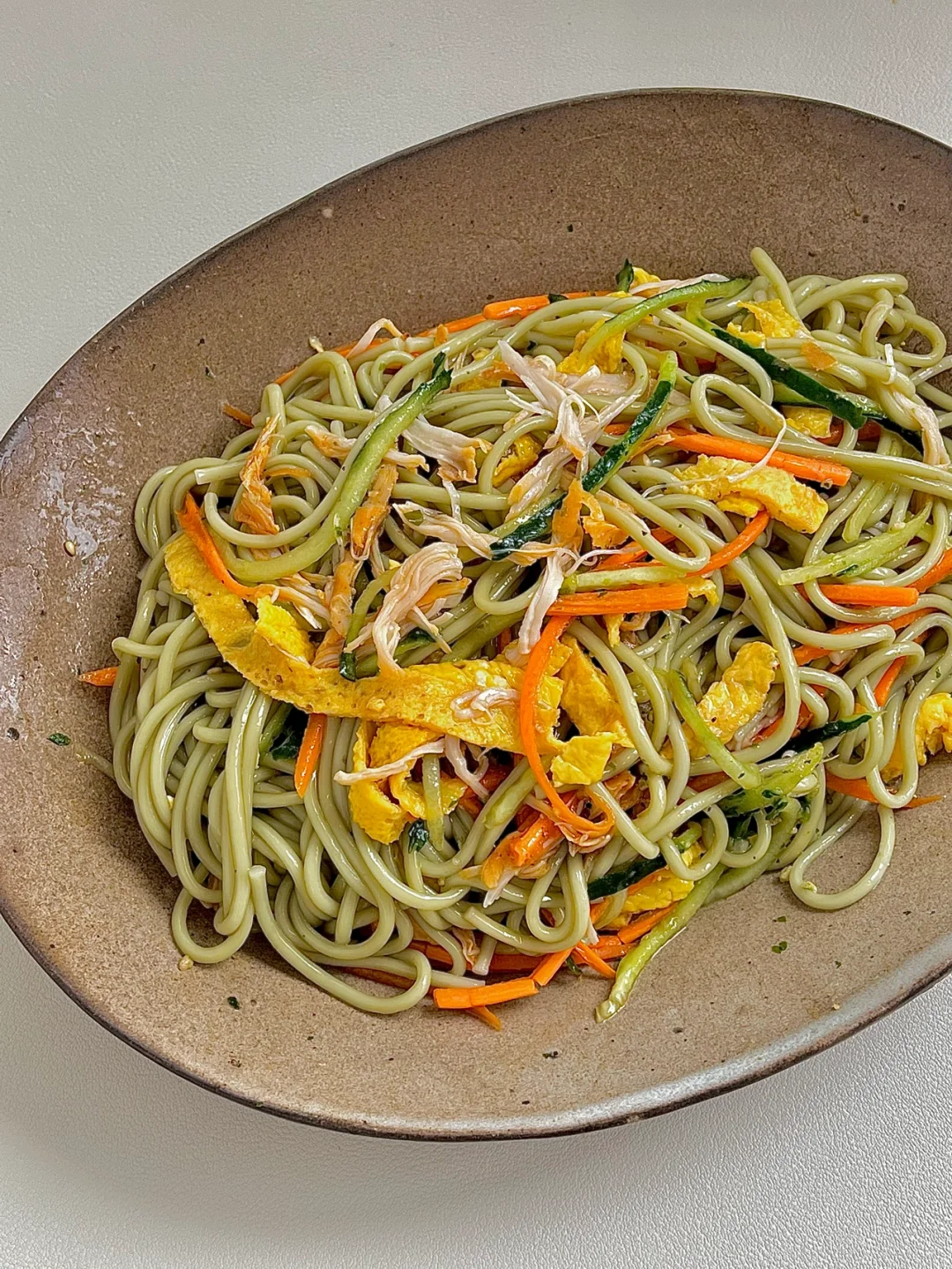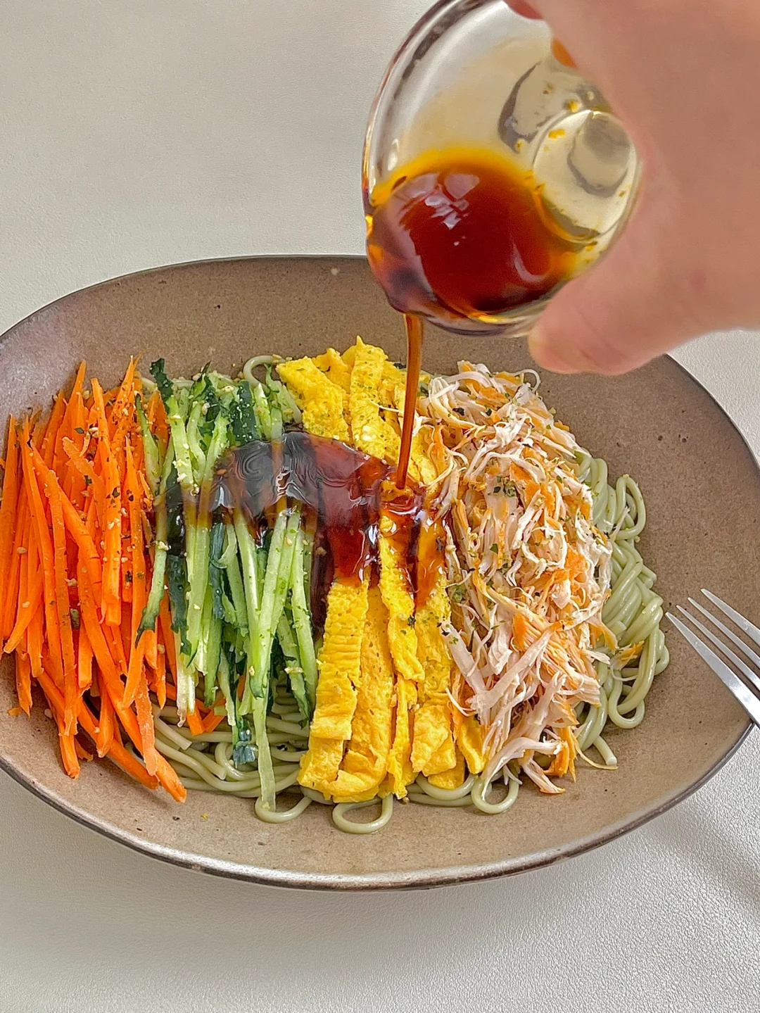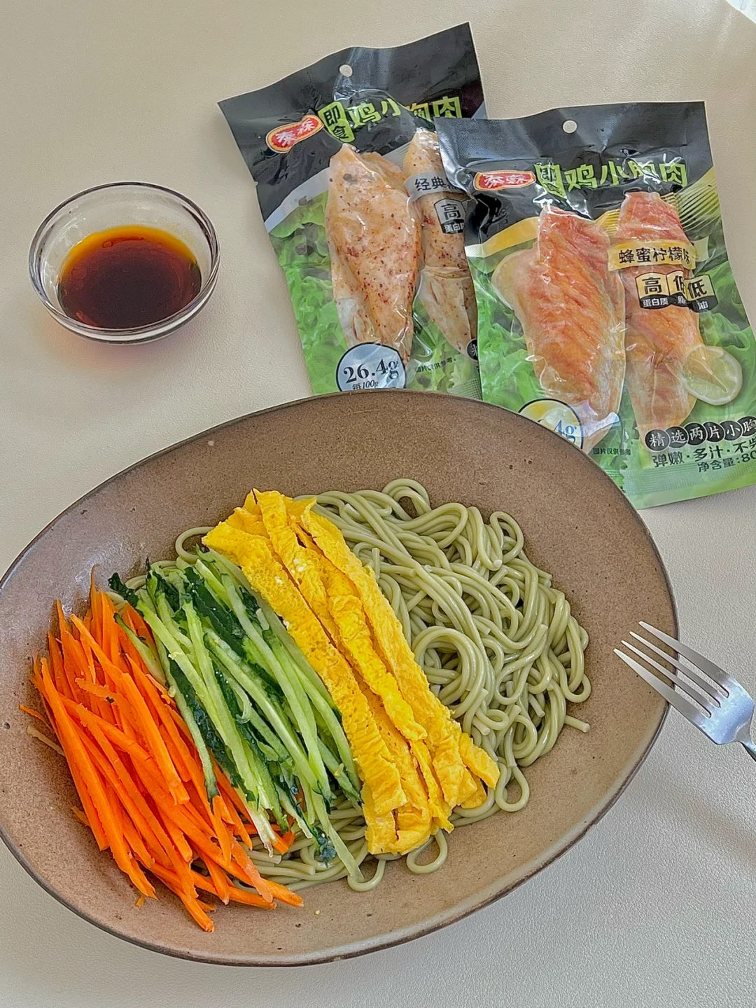 🥒食材:黄瓜,胡萝卜,鸡蛋,即食鸡小胸肉,低脂面条(荞麦面都可以)油醋汁。