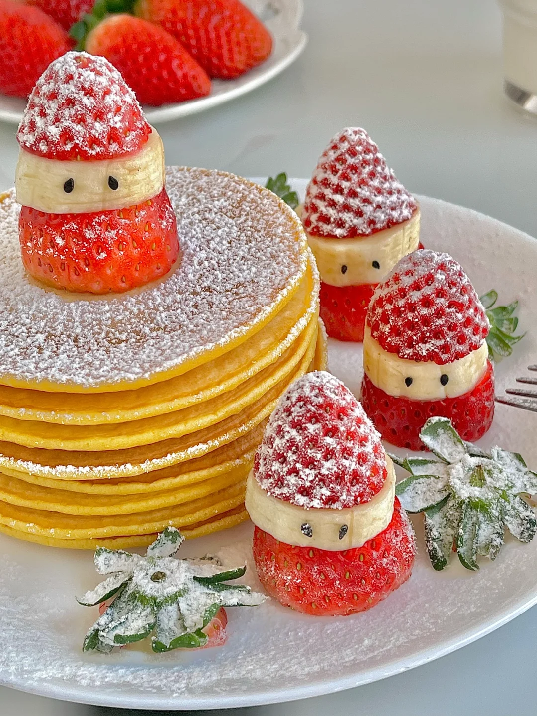 5️⃣用草莓和香蕉做成小雪人装饰。没有绿树就用草莓底代替,最后筛入一层糖粉,装饰成厚厚的雪的感觉,有圣诞那味了~