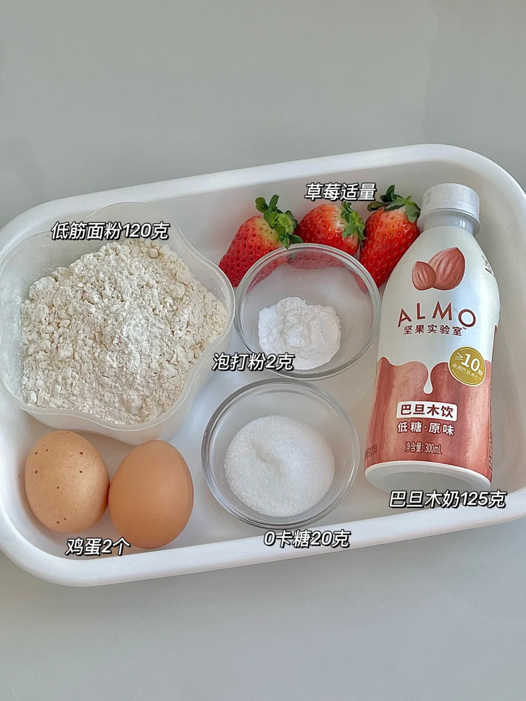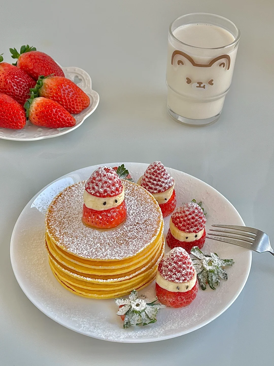 🥞配料:低筋面粉120克,鸡蛋2个,0卡糖20克,泡打粉2克,澳洲巴旦木奶125克,草莓和香蕉适量(做雪人的)