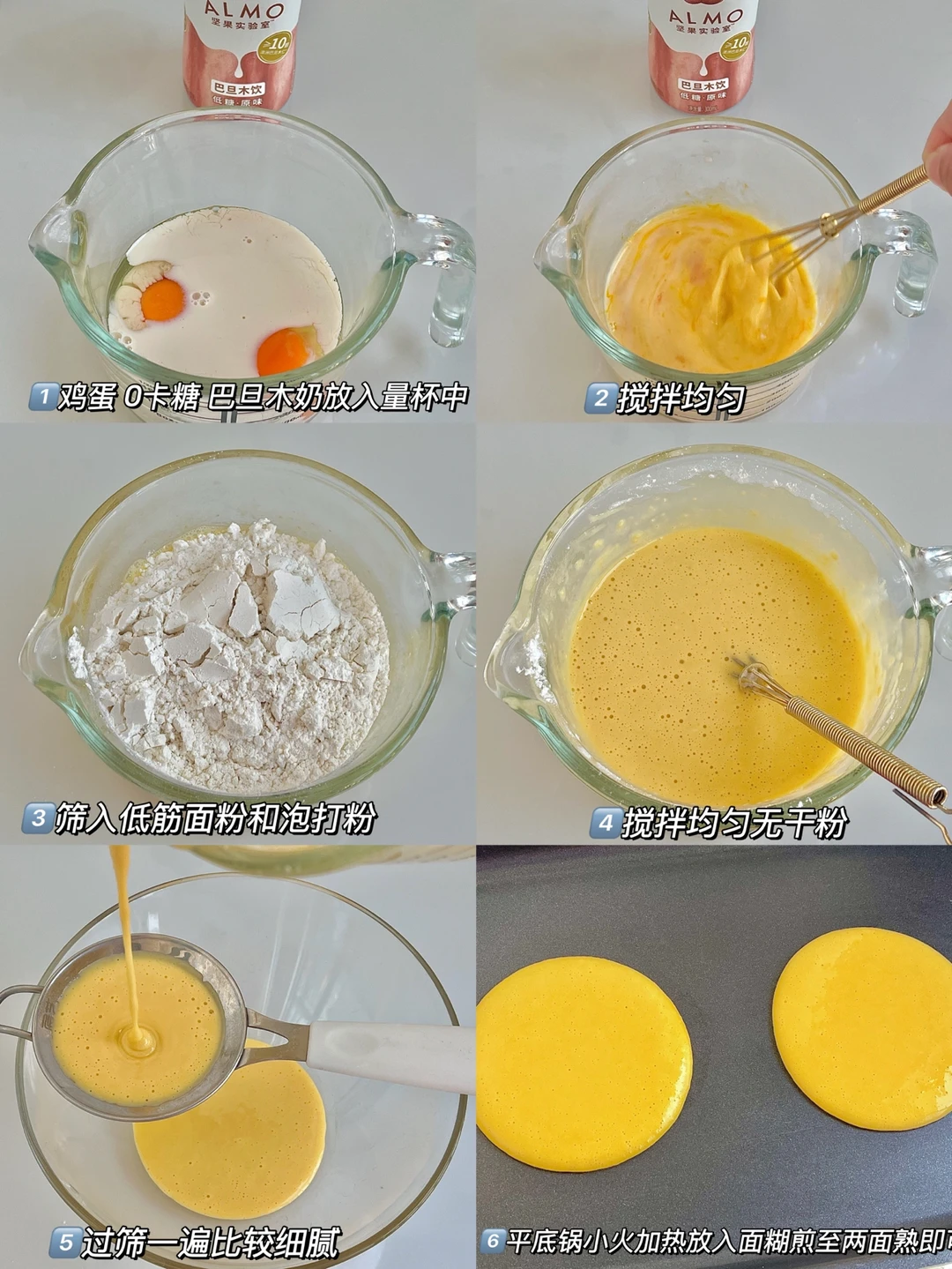 4️⃣平底锅预热好不用刷油,倒入一勺面糊,表面冒小泡泡后翻面再煎十几秒即可。