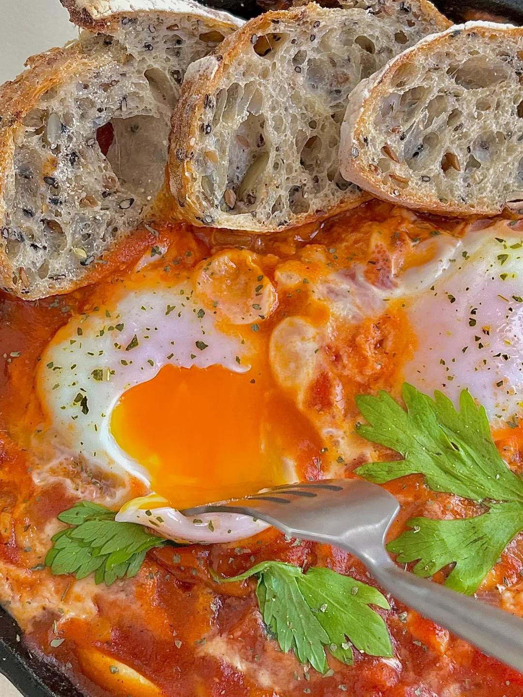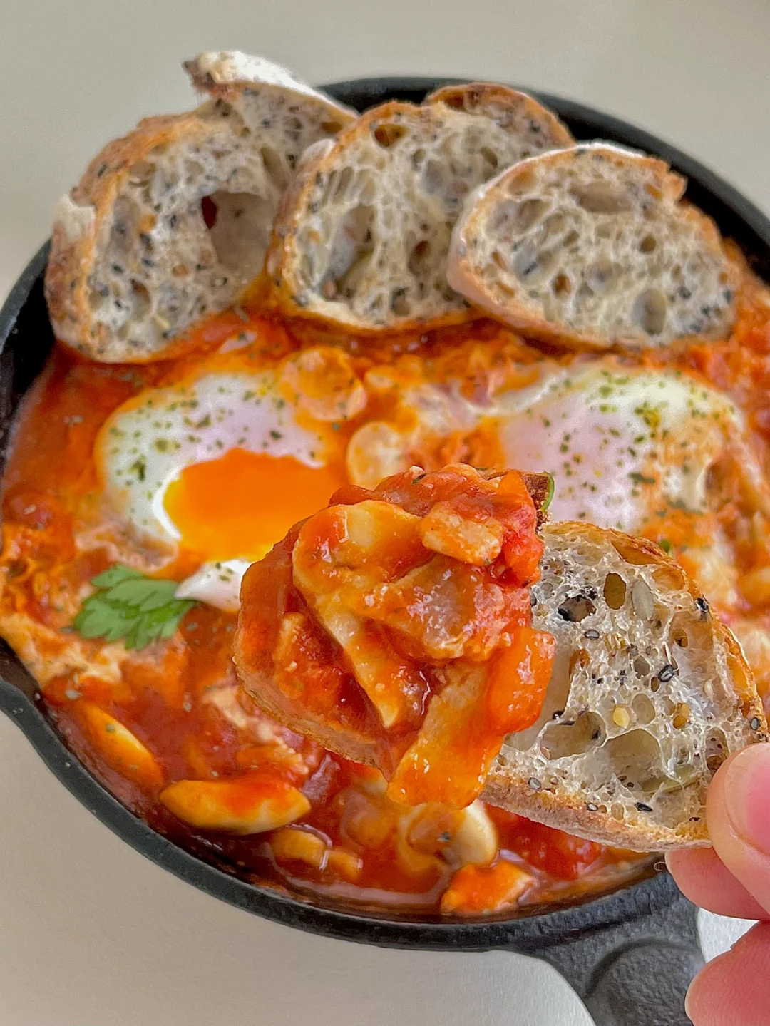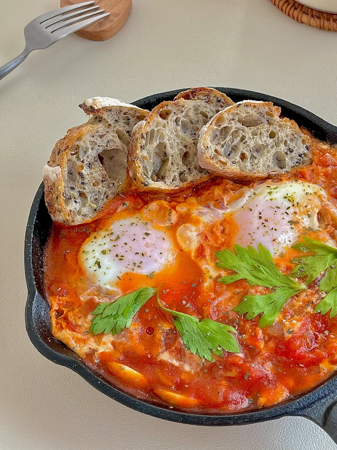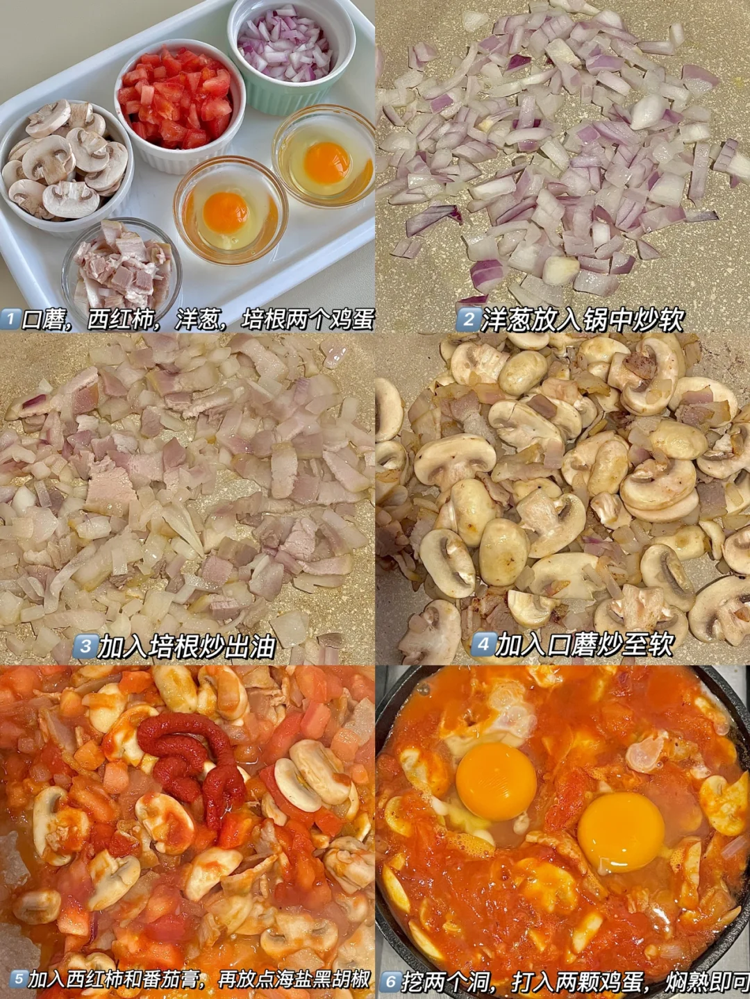 好久没吃北非蛋了,正好家里的食材齐全赶紧安排上,这个真的好好吃,法棍都没够我吃😂 . 🍅食材:洋葱,口蘑,西红柿,培根,鸡蛋 🍅做法: 1️⃣热锅喷橄榄油,放入洋葱炒软。 2️⃣培根放进去炒出油脂。 3️⃣加入口蘑炒软。 4️⃣放入西红柿丁炒碎,在加入些番茄膏,这样颜色更好看,味道也更好,再来点海盐黑胡椒。 5️⃣中间挖两个坑放入鸡蛋,焖至鸡蛋凝固即可。 . 也可以用烤箱烤,我是直接把炒好的东西放入铸铁锅中鸡蛋焖熟就可以了。真的太费法棍了,吃一次感叹一次,怎么会那么好吃😋
