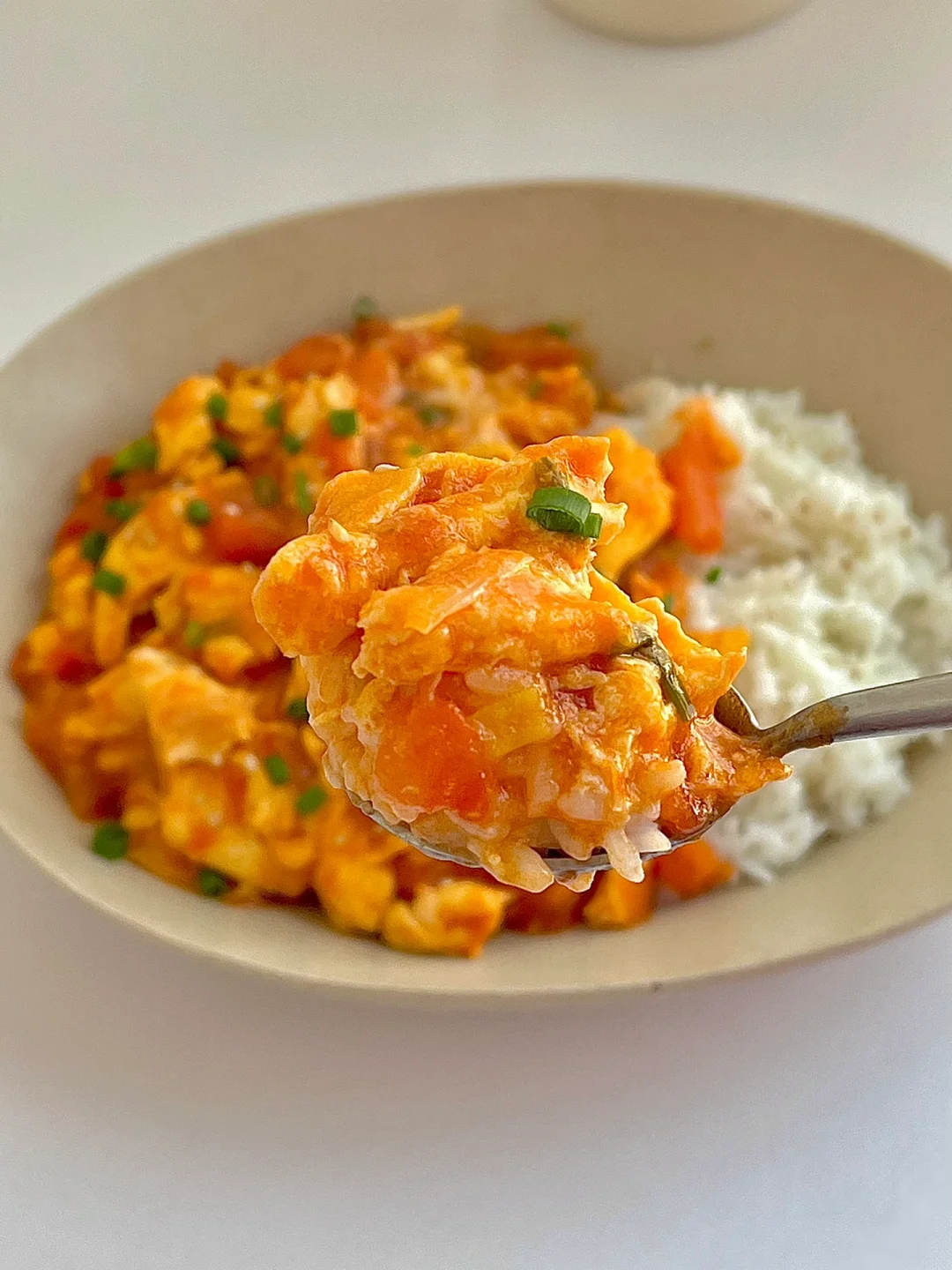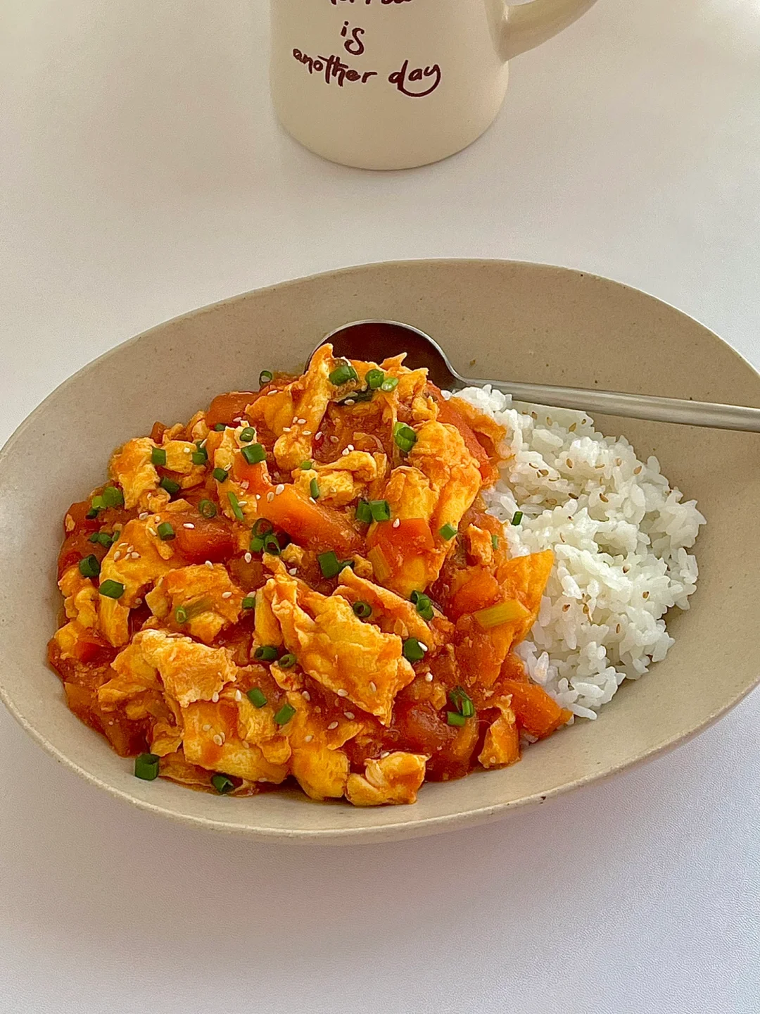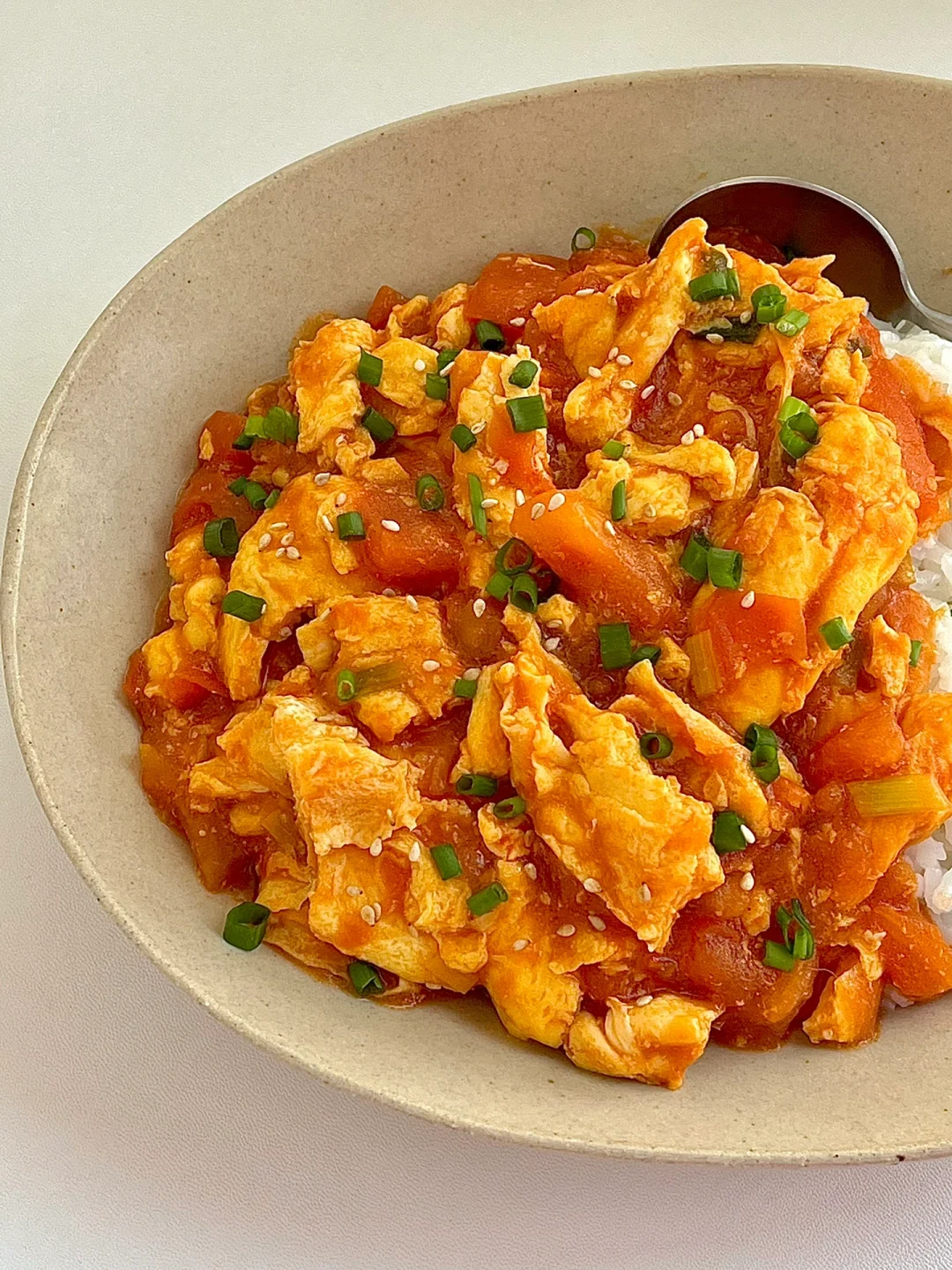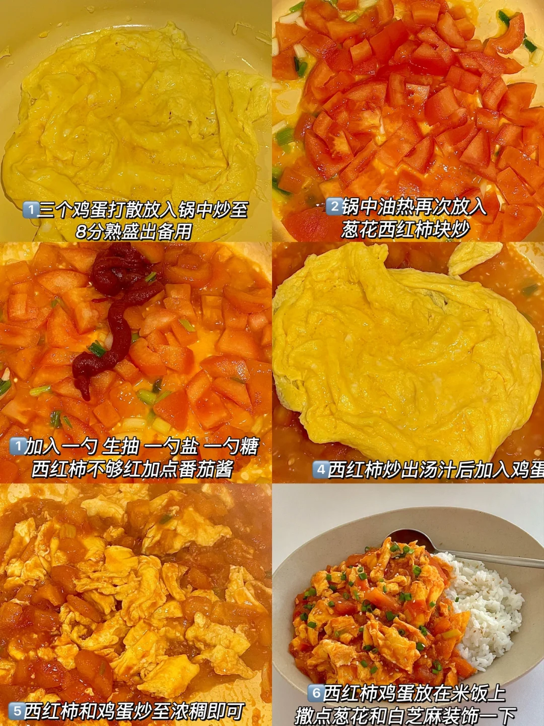 5️⃣西红柿鸡蛋盖在米饭上,撒点葱花和白芝麻。