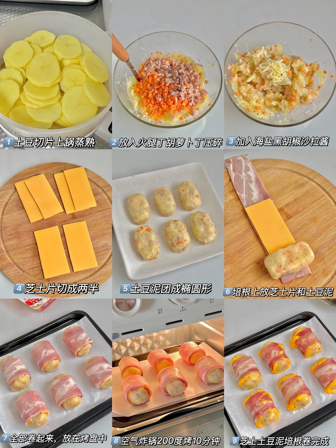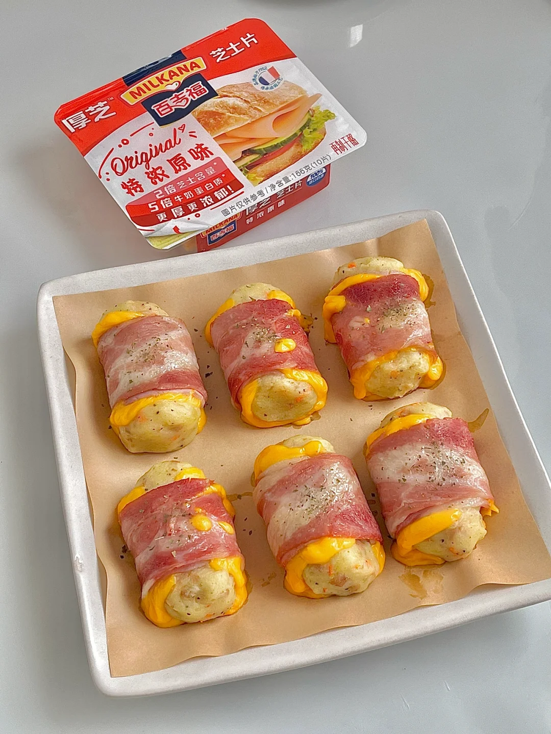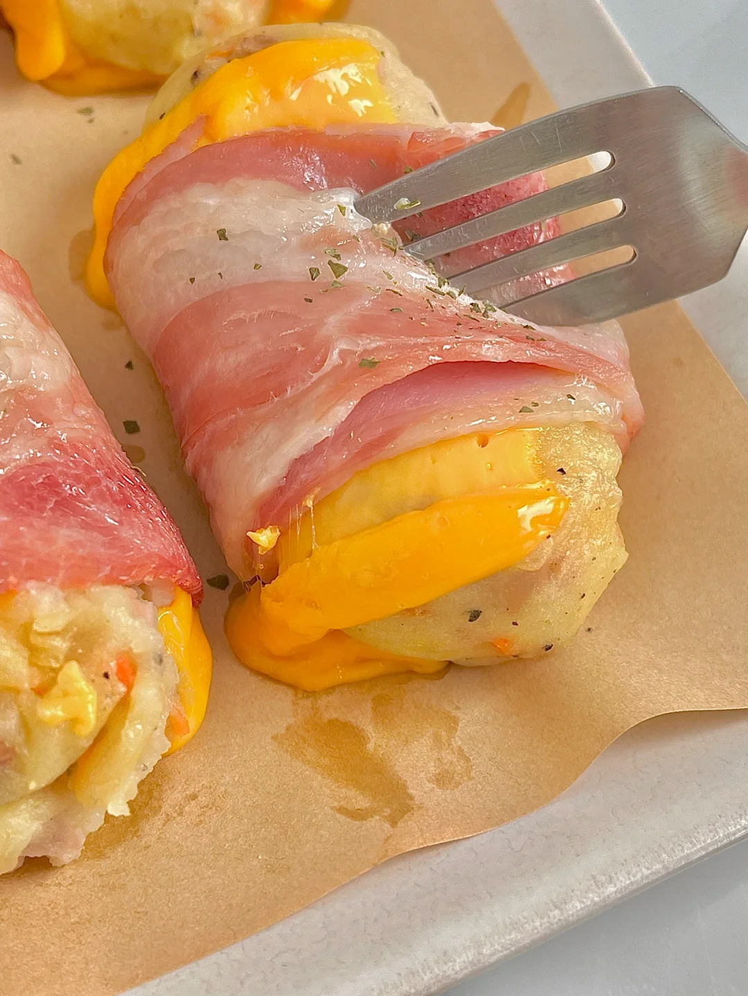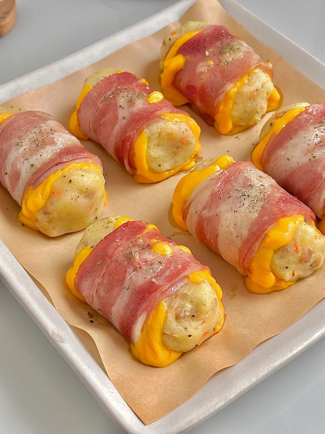 5️⃣培根放上芝士片和土豆泥卷起来。