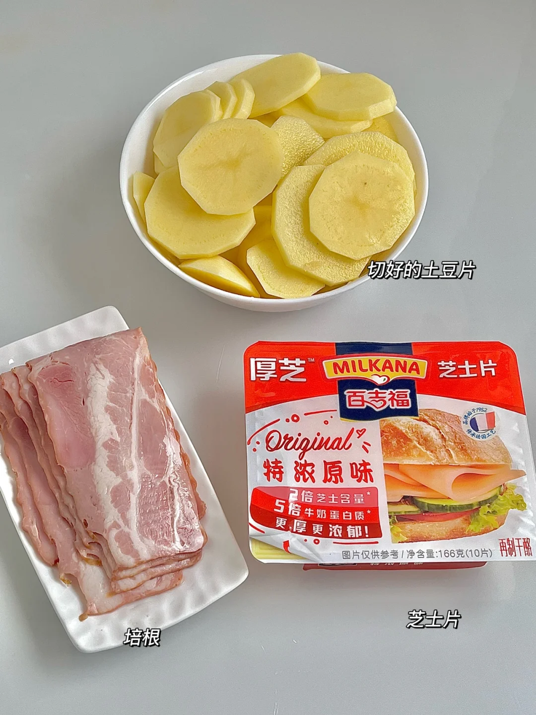 🧀食材:切好的土豆片(我用了两个小土豆),培根六片,芝士片