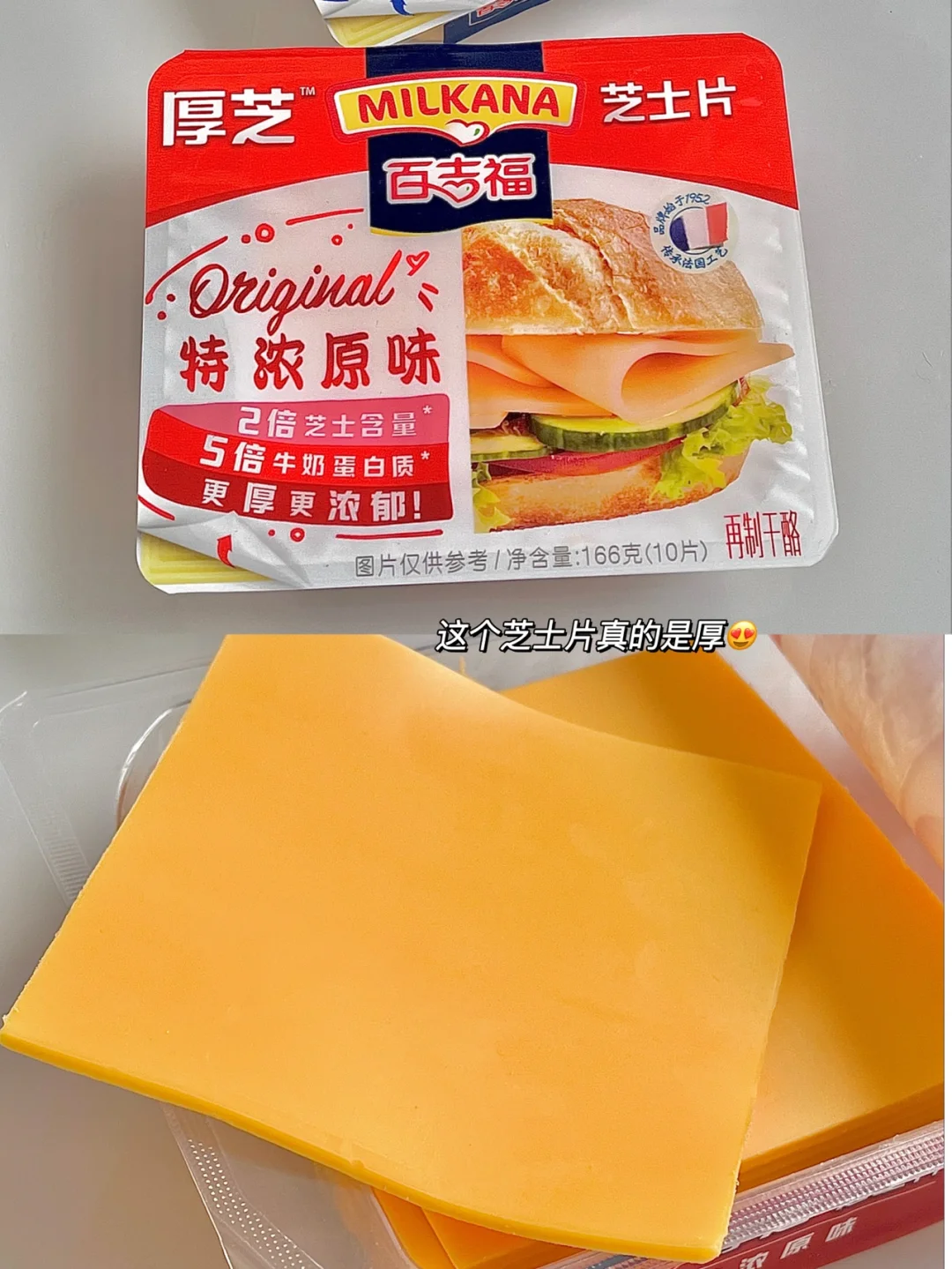 试一下 刚买到的厚芝芝士片,真的是第一次用到这么厚的芝士片,好奇心的驱使下pick了它。没想到出餐效果惊奇的好,爆浆流心、奶香味超级浓郁,跟我之前买的的芝士片相比,口感和爆浆程度都要好很多。回看才意识到这是百吉福家的,并且还有50%的干酪含量,爱了爱了,芝士爱好者也赶紧冲呀!