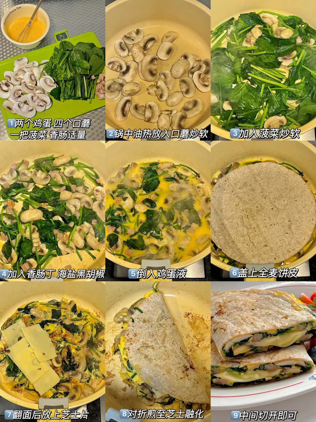 🌯食材:全麦饼皮一张 菠菜适量 鸡蛋两个 口蘑四个个 芝士两片 小香肠一根