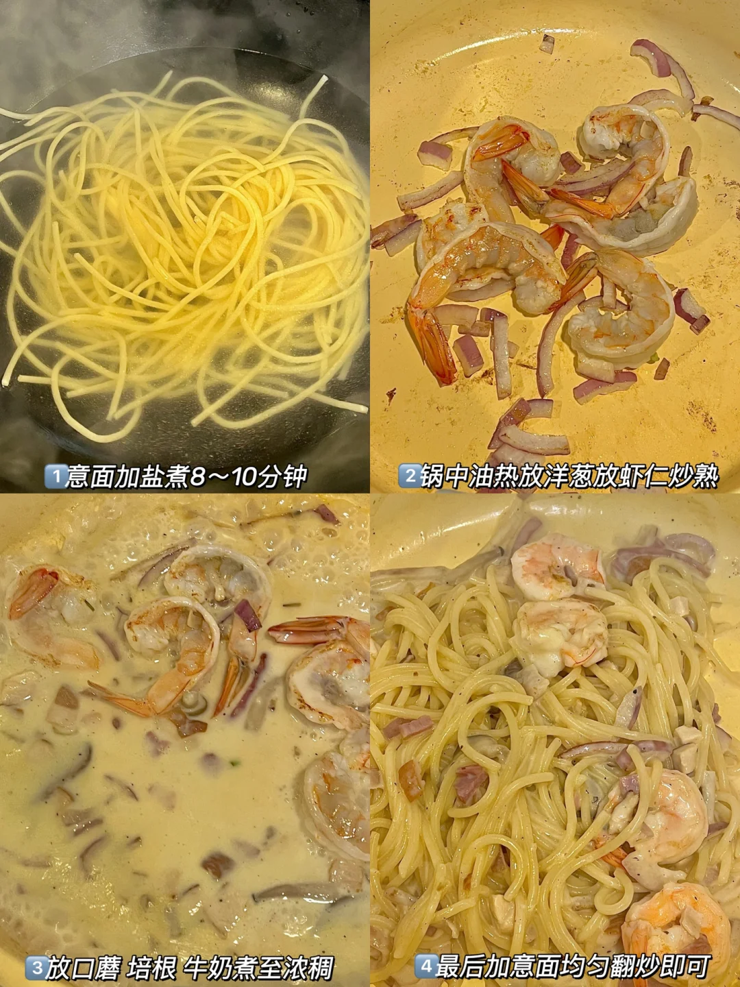 热气腾腾的三餐 今日份早午餐分享: 虾仁培根蘑菇奶油意面🍝 一杯美式☕️ . 好久没吃意面了,周末想吃啥就安排上😋 🍝食材:意面 虾仁 洋葱 口蘑 培根 🍝做法: 1️⃣水开放意面,放点油和盐。煮8~10分钟捞出。 2️⃣培根和口蘑切碎,洋葱切丁。 3️⃣锅中油热放入洋葱炒软,在放虾仁炒熟。 4️⃣加入培根口蘑碎炒软,加入牛奶煮开。 5️⃣加入意面,来点海盐黑胡椒,煮至浓稠即可。 . 低卡版的奶油意面,奶香浓郁,贼好吃😋 把口蘑和培根切的碎一点更好吃入味! 周末愉快呀[派对R]