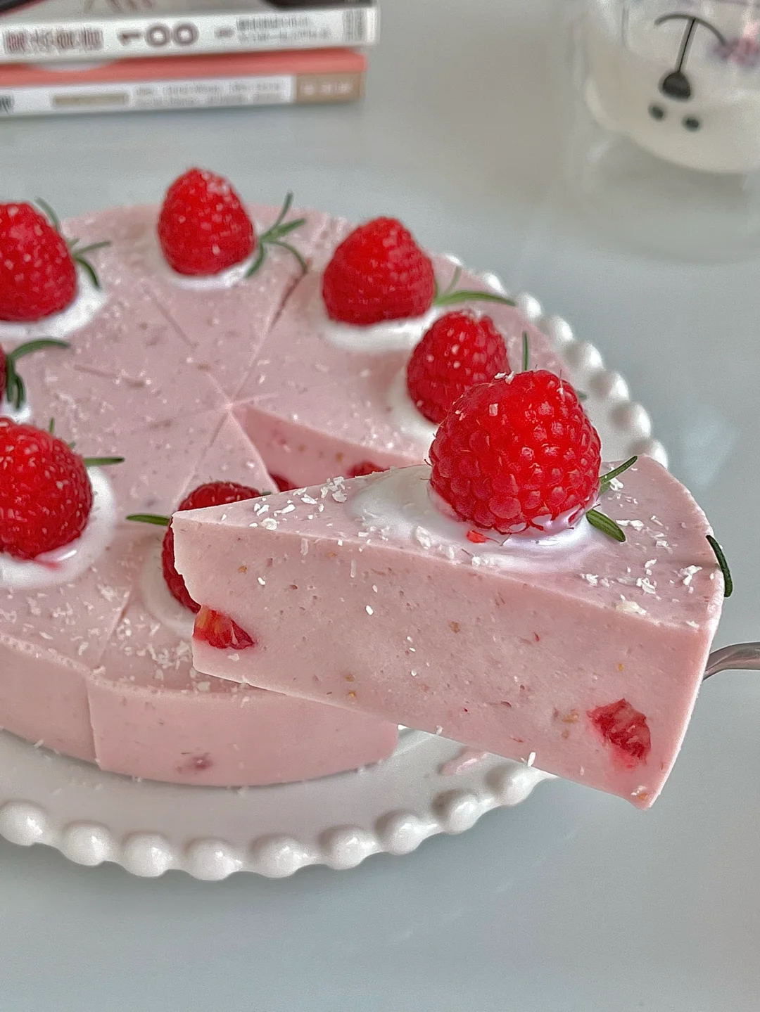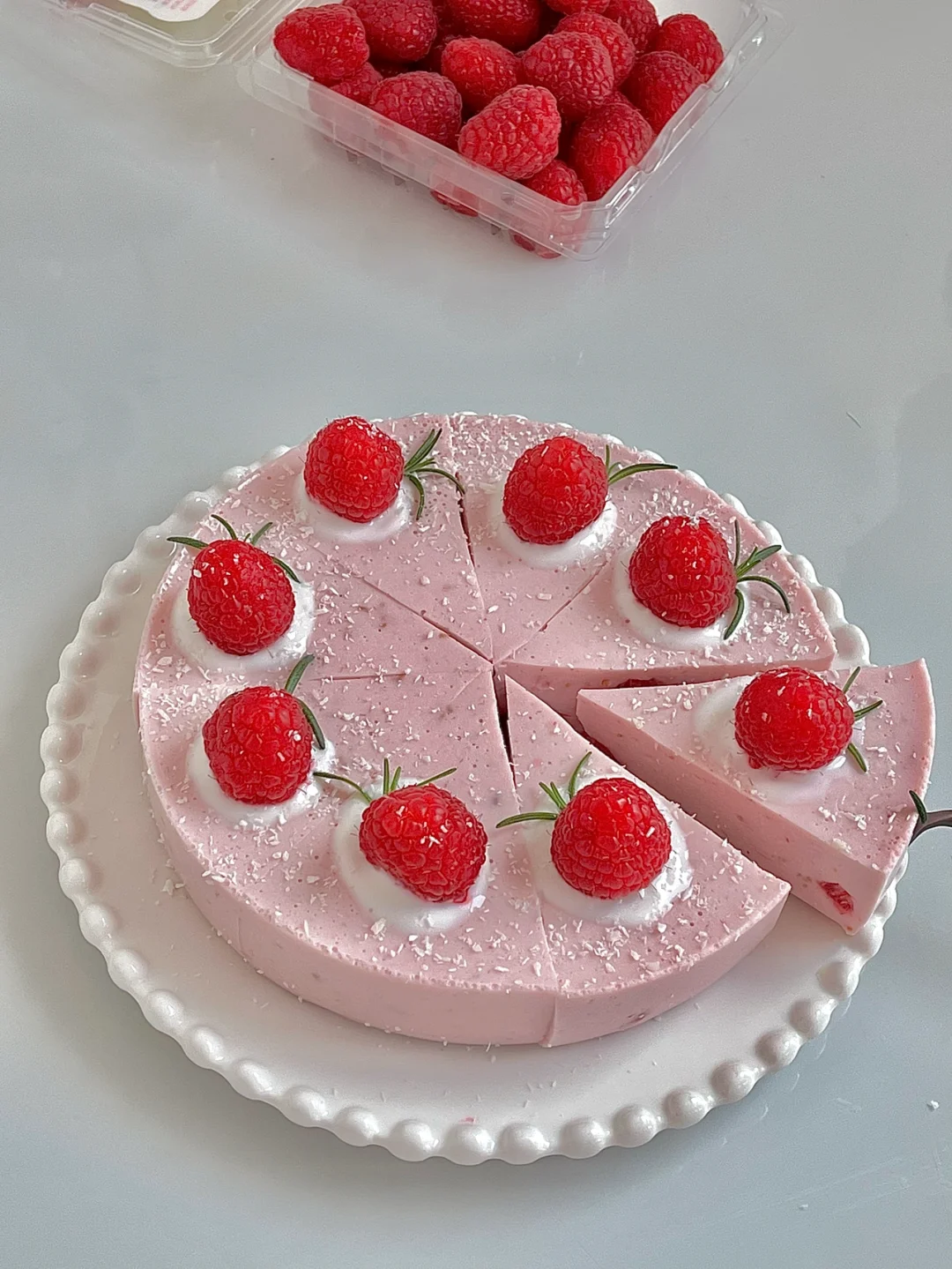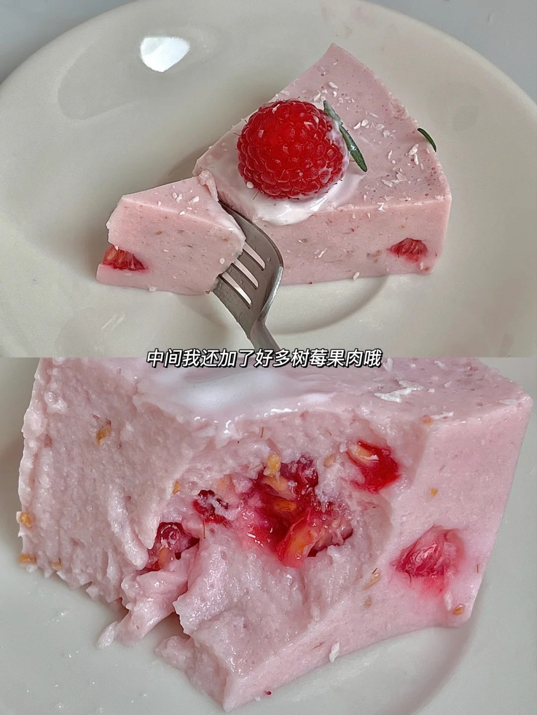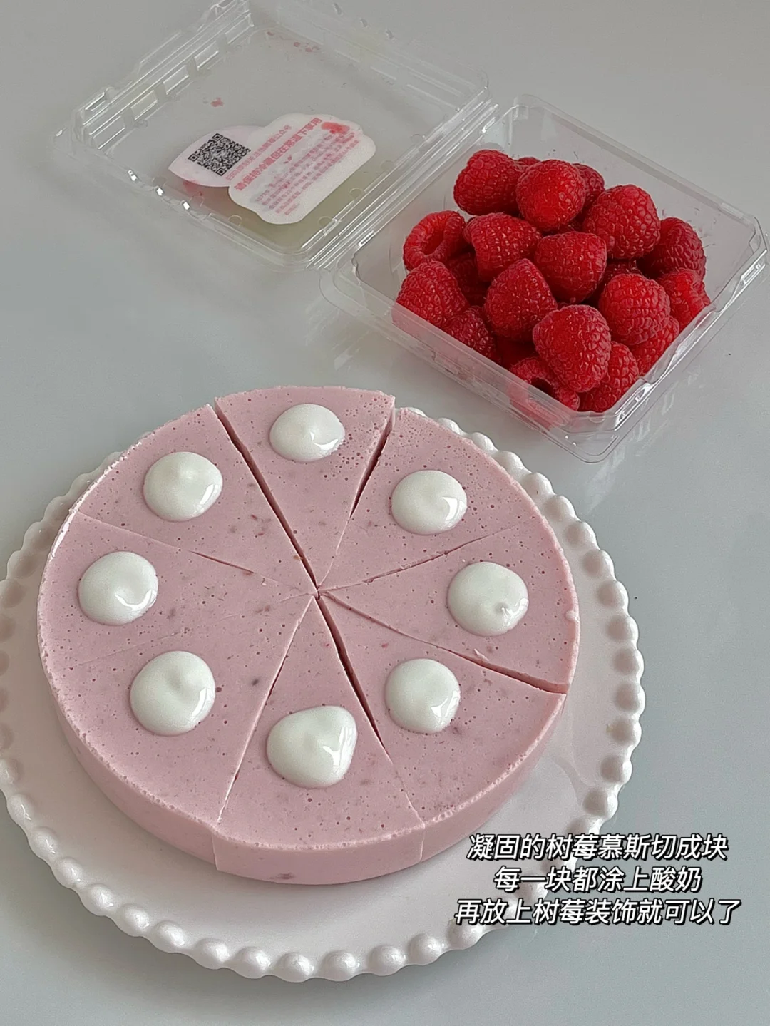 6️⃣凝固好的慕斯蛋糕切成八块,每一块挤上酸奶放上树莓,最后撒点椰蓉即可。