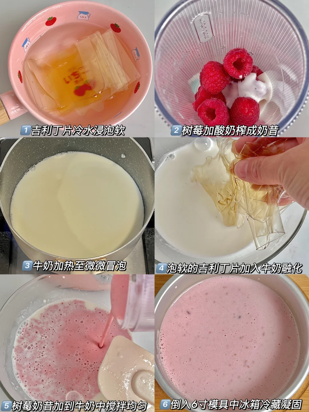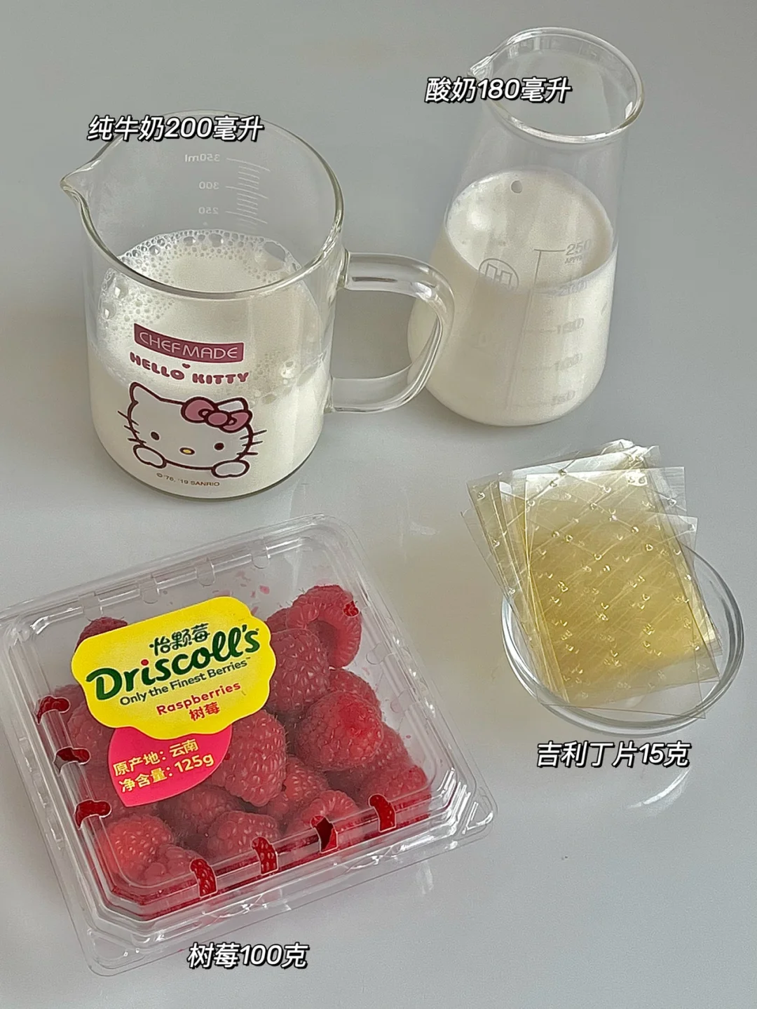 🍰食材:牛奶200毫升,酸奶180毫升,树莓100克(慕斯中榨汁部分),吉利丁片15克。
