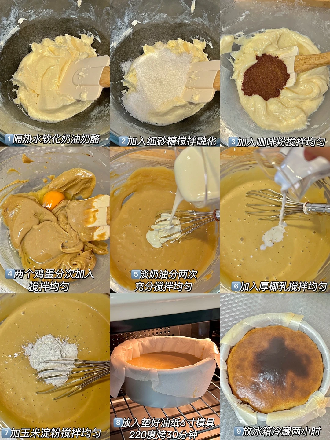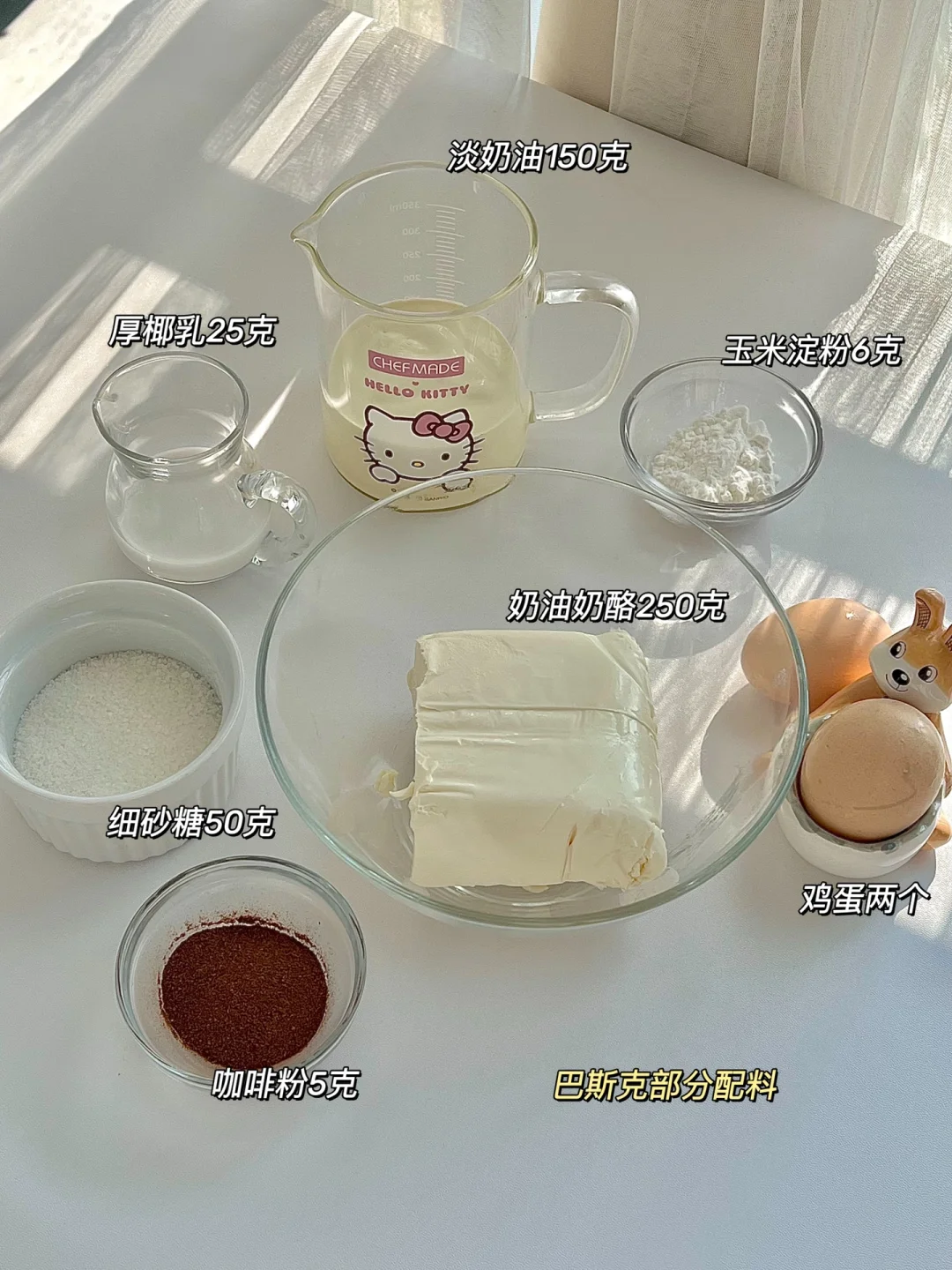 🍰巴斯克部分配料:奶油奶酪250克,淡奶油150克,鸡蛋两个,细砂糖50克,厚椰乳25克,咖啡粉5克,玉米淀粉6克