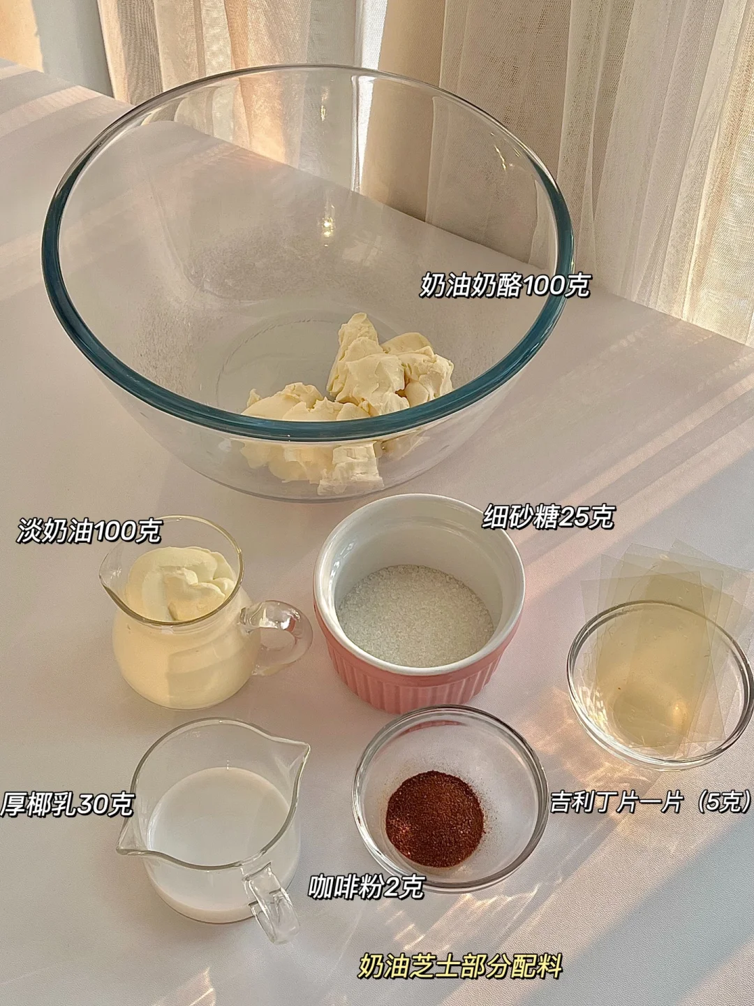 🍰奶油芝士部分配料:奶油奶酪100克,淡奶油100克,细砂糖25克,厚椰乳30克,咖啡粉2克,吉利丁片5克。