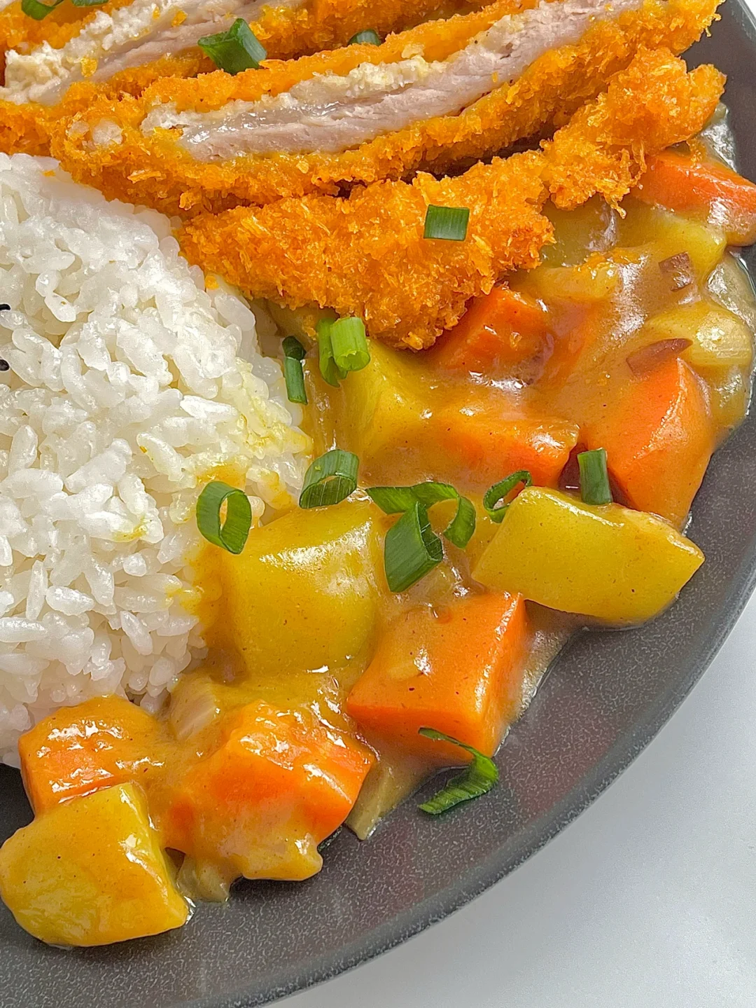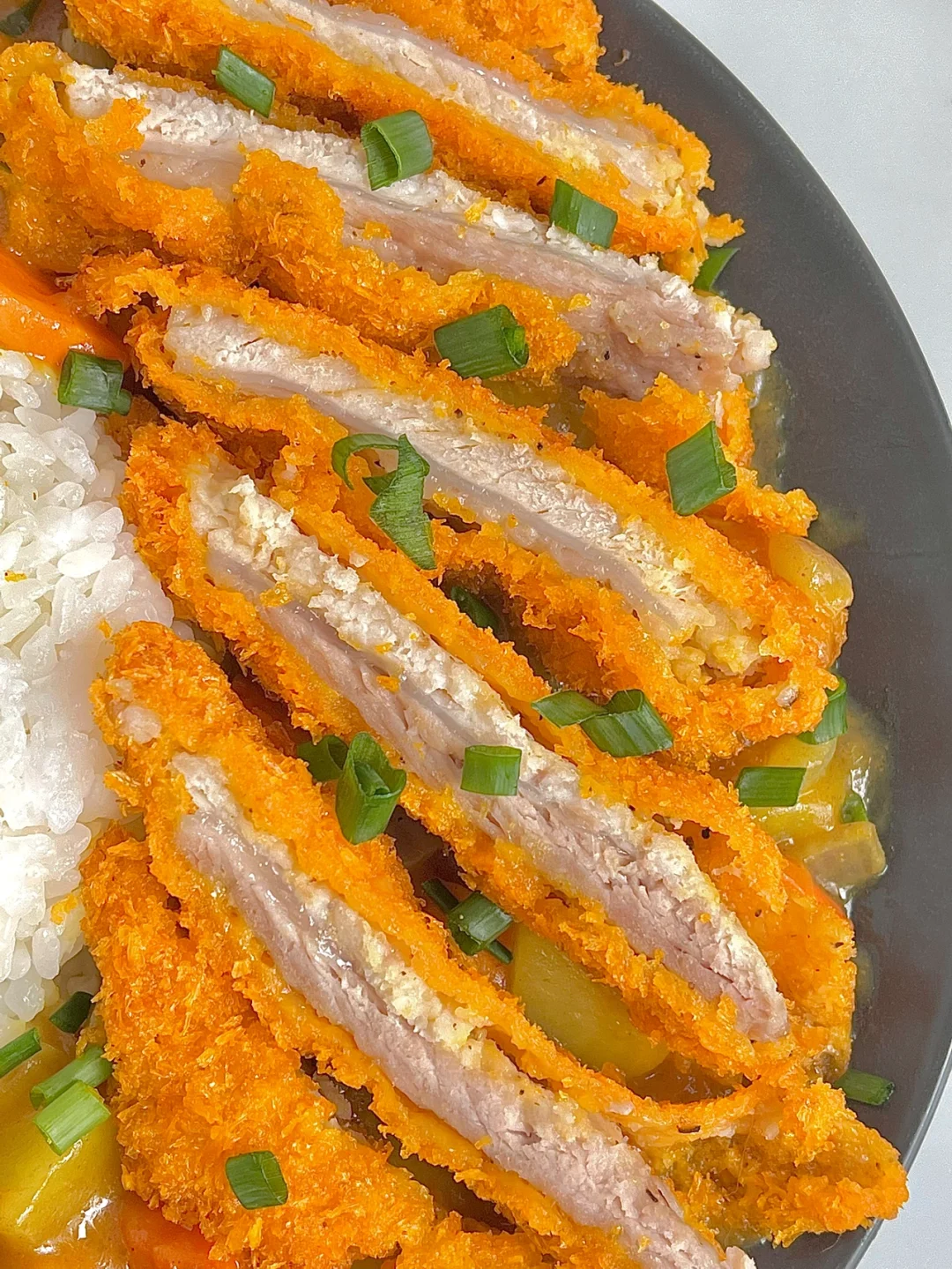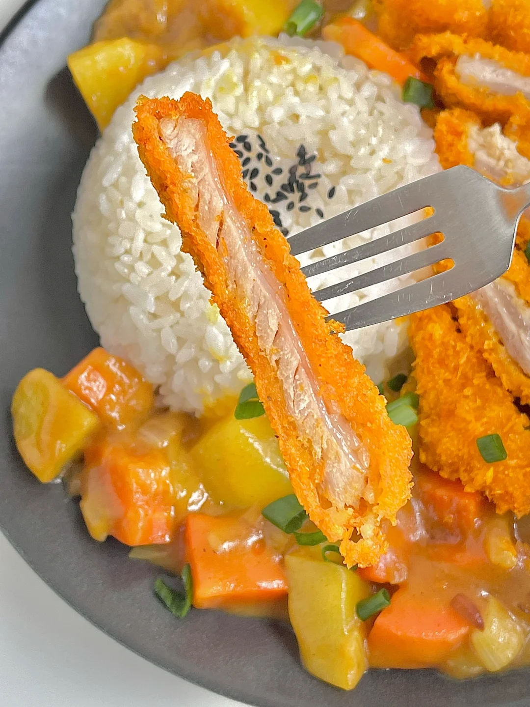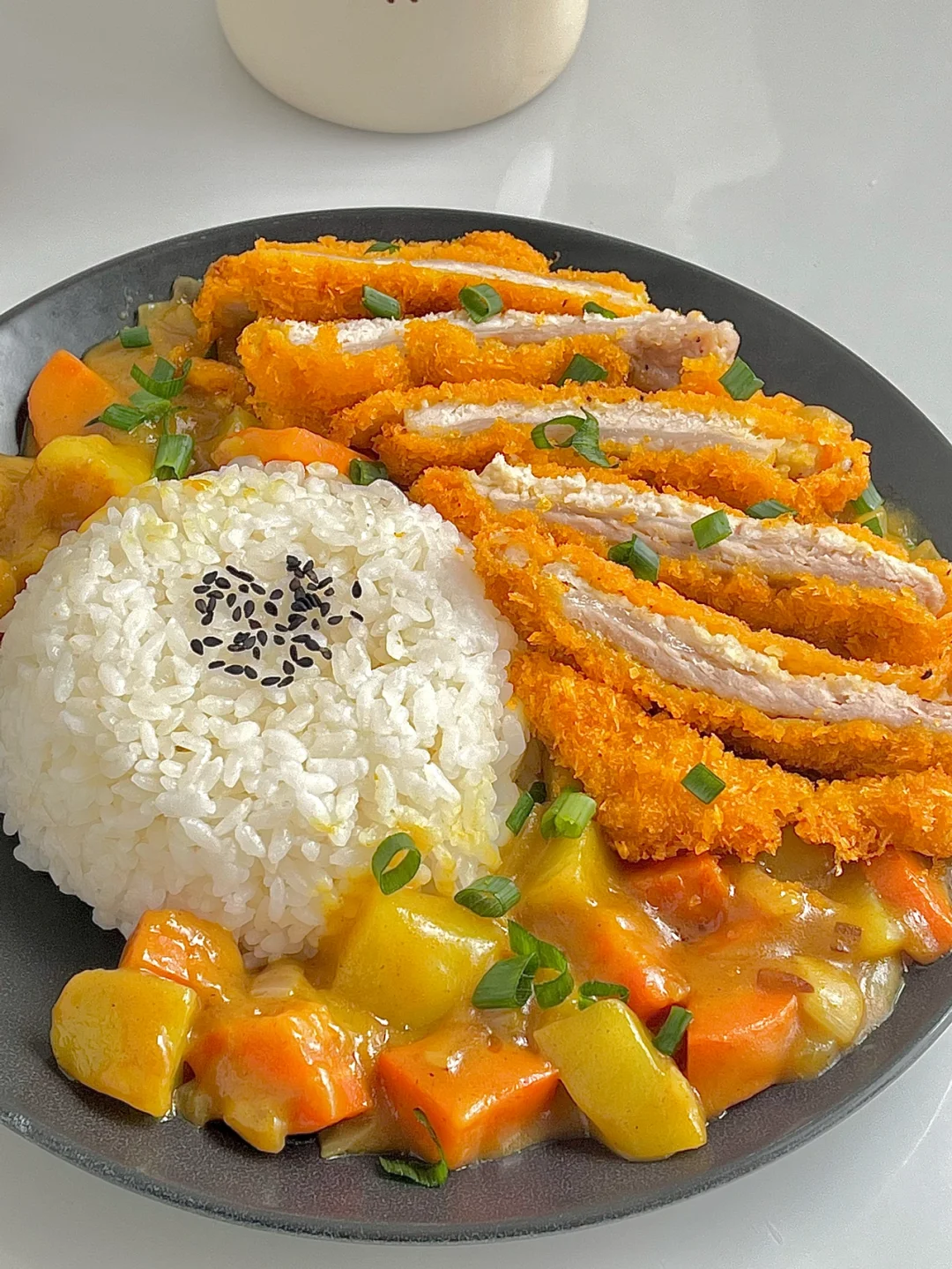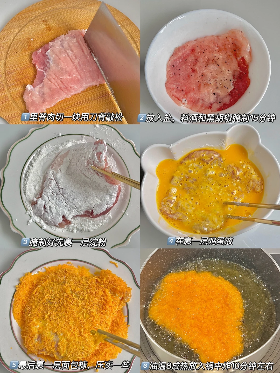 🍖配料:猪排配料(里脊肉 盐 黑胡椒 料酒 淀粉 鸡蛋 面包糠)咖喱酱做法(洋葱丁,胡萝卜丁,土豆丁,咖喱块)